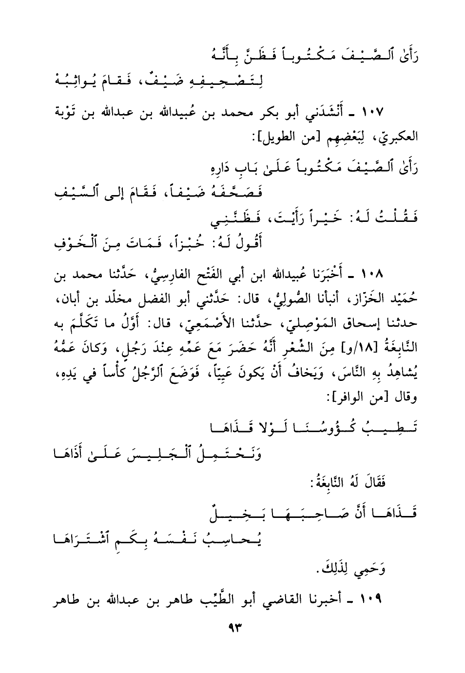 107 - أنشدني أبو بكر مُحَمَّد بْن عبيد اللَّه بْن عبد اللَّه بْن توبة العكبري، لبعضهم من الطويل: «