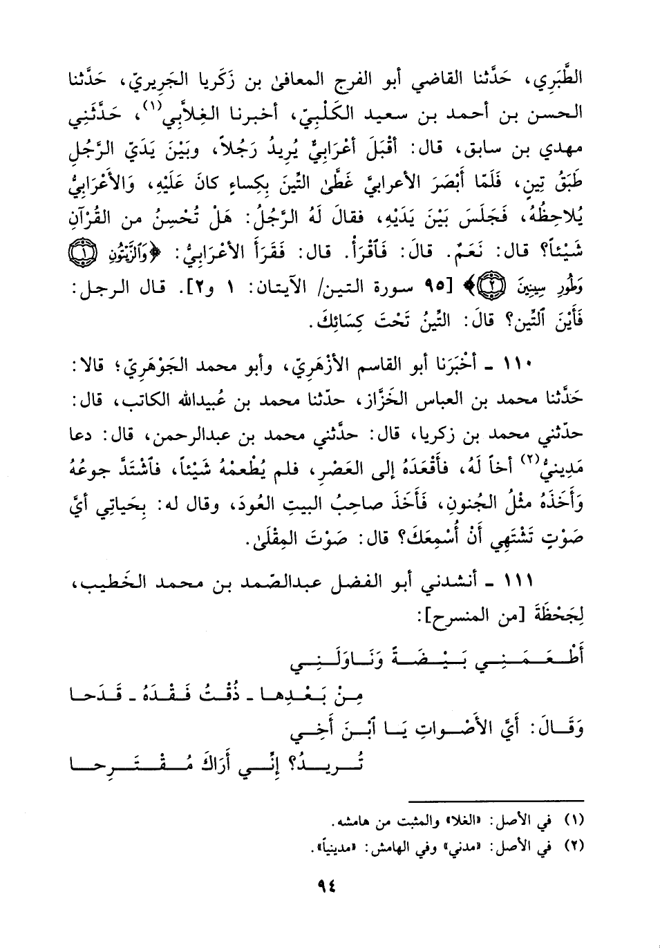 111 - أنشدني أبو الفضل عبد الصمد بْن مُحَمَّد الخطيب، لجحظة من المنسرح: "