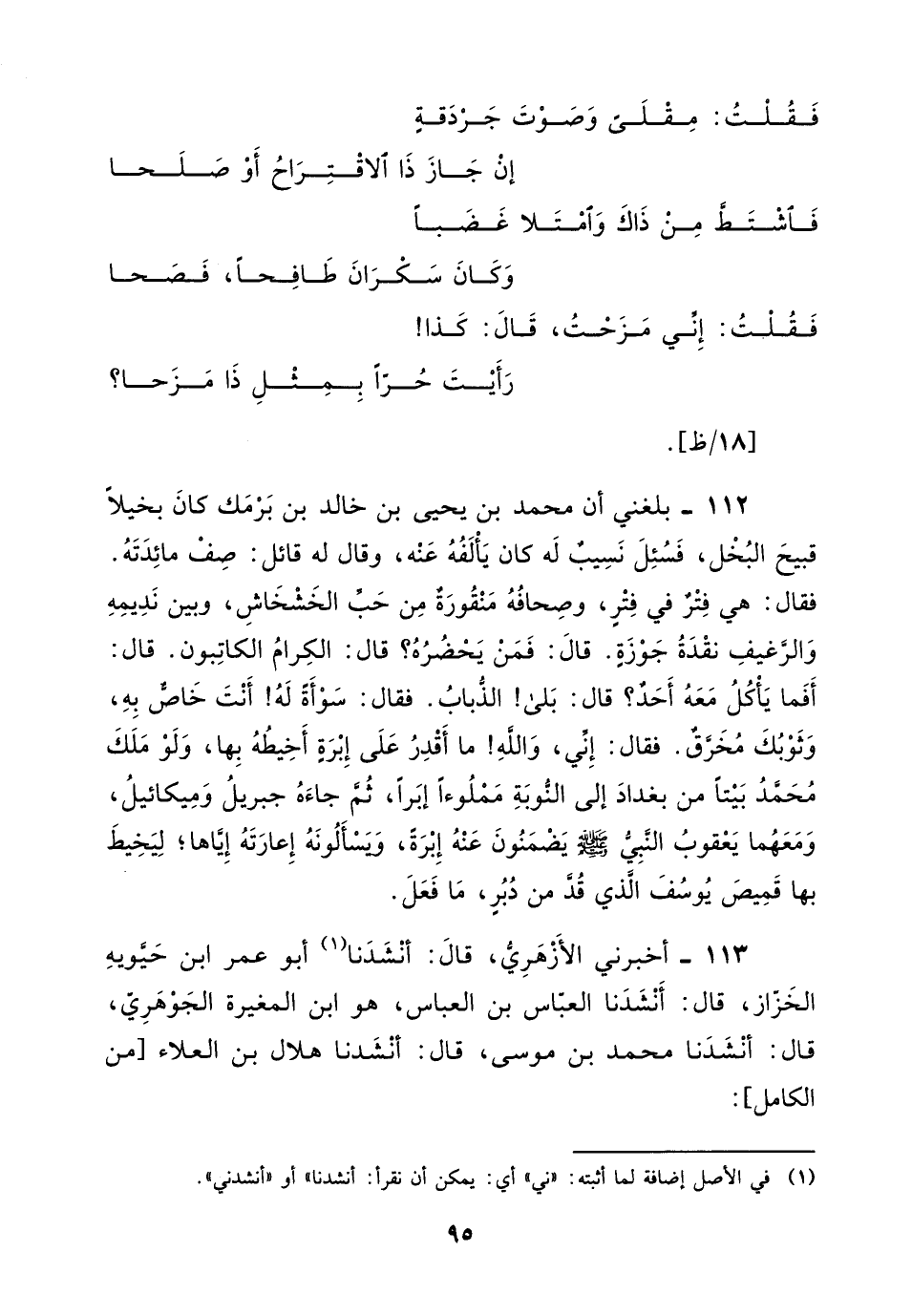 113 - أخبرني الأزهري، قَالَ: أنشدنا أبو عمر بْن حيويه الخزاز، قَالَ: أنشدنا العباس بْن العباس هو ابن المغيرة الجوهري، قَالَ: أنشدنا مُحَمَّد بْن موسى، قَالَ: أنشدنا هلال بْن العلاء من الكامل: «