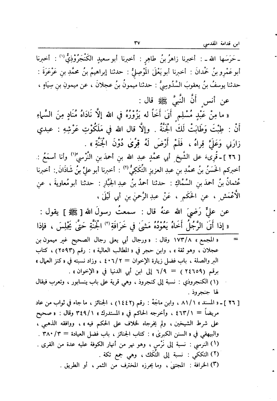 26 - قرى على الشَّيْخ أبي مُحَمَّد عبد الله بن أَحْمد بن النَّرْسِي وَأَنا أسمع أخْبركُم الْحسن بن مُحَمَّد بن عبد الْعَزِيز التككي أخبرنَا أَبُو عَليّ بن شَاذان أخبرنَا عُثْمَان بن أمد بن السماك حَدثنَا أَحْمد بن عبد الْجَبَّار حَدثنَا أَبُو مُعَاوِيَة عَن الْأَعْمَش عَن الحكم عَن عبد الرَّحْمَن بن أبي ليلى