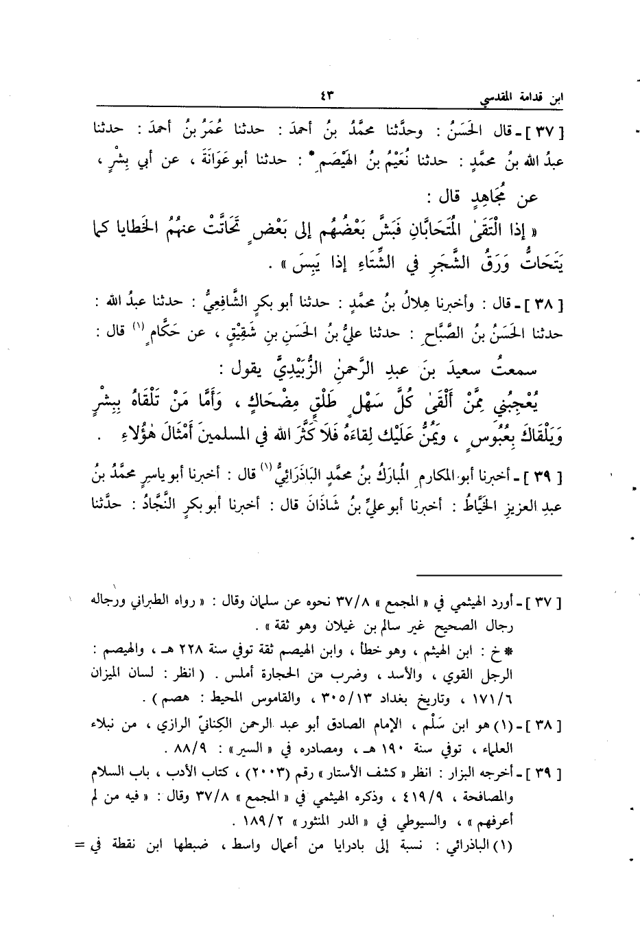 39 - أخبرنَا أَبُو المكارم الْمُبَارك بن مُحَمَّد الباذرائي قَالَ أخبرنَا أَبُو يَاسر مُحَمَّد بن عبد الْعَزِيز الْخياط أخبرنَا أَبُو عَليّ بن شَاذان قَالَ أخبرنَا أَبُو بكر النجاد حَدثنَا
