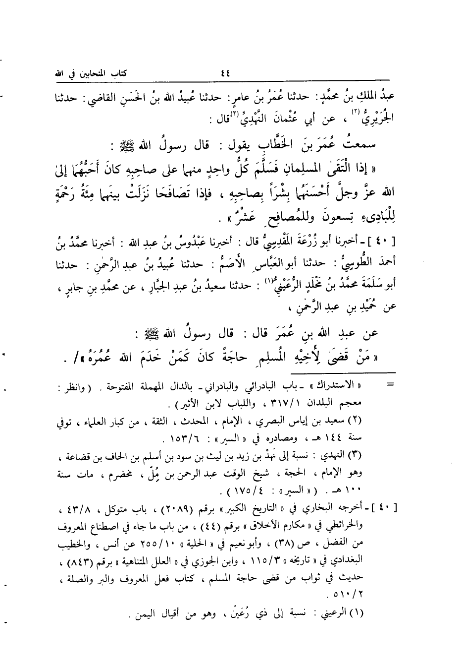40 - أخبرنَا أَبُو زرْعَة الْمَقْدِسِي قَالَ أخبرنَا عَبدُوس بن عبد الله أخبرنَا مُحَمَّد بن أَحْمد الطوسي حَدثنَا أَبُو الْعَبَّاس الْأَصَم حَدثنَا عبيد بن عبد الرَّحْمَن حَدثنَا أَبُو سَلمَة مُحَمَّد بن مخلد الرعيني حَدثنَا سعيد بن عبد الْجَبَّار عَن مُحَمَّد بن جَابر عَن حميد بن عبد الرَّحْمَن