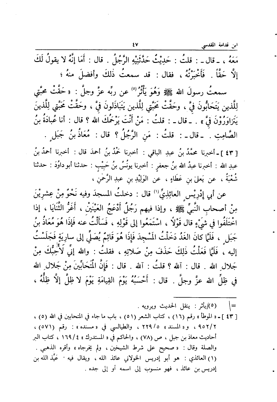عَن أبي إِدْرِيس العائدي قَالَ دخلت الْمَسْجِد وَفِيه نَحْو من عشْرين من أَصْحَاب النَّبِي صلى الله عَلَيْهِ وَسلم وَإِذا فيهم رجل أدعج الْعَينَيْنِ أغر الثنايا إِذا اخْتلفُوا فِي شَيْء قَالَ قولا اسْتَمعُوا إِلَى قَوْله فَسَأَلت عَنهُ فَإِذا معَاذ بن جبل فَلَمَّا كَانَ الْغَد دخلت الْمَسْجِد فَإِذا هُوَ قَائِم يُصَلِّي إِلَى سَارِيَة فَجَلَست إِلَيْهِ فَلَمَّا فعلت ذَلِك حذف من صلَاته فَقلت وَالله إِنِّي لَأحبك من جلال الله قَالَ آللَّهُ قلت آللَّهُ قَالَ فَإِن المتحابين من جلال الله فِي ظلّ الله عز وَجل قَالَ أَحْسبهُ يَوْم الْقِيَامَة يَوْم لَا ظلّ إِلَّا ظله