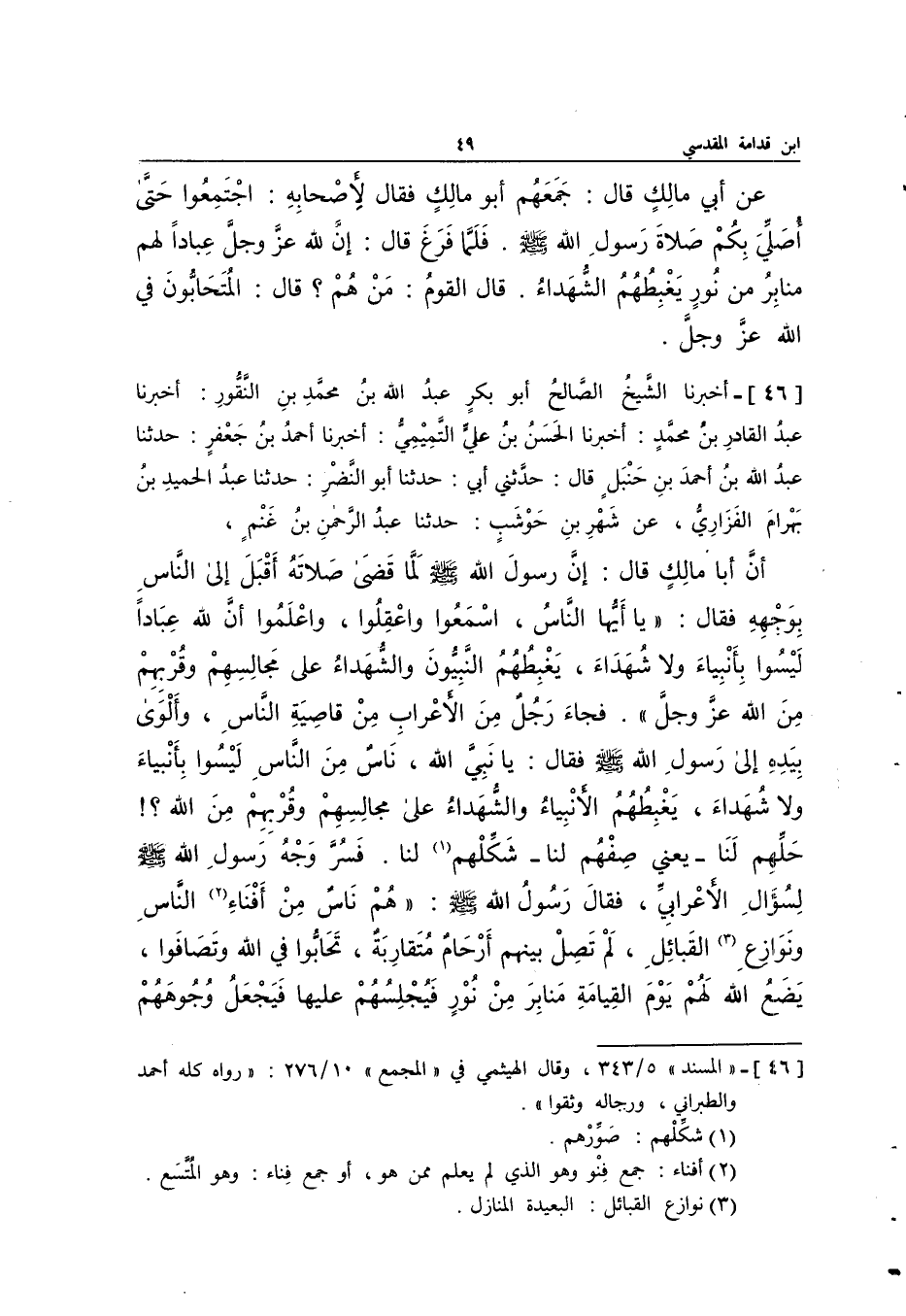 أَن أَبَا مَالك قَالَ أَن رَسُول الله صلى الله عَلَيْهِ وَسلم لما قضى صلَاته أقبل إِلَى النَّاس بِوَجْهِهِ فَقَالَ يَا أَيهَا النَّاس اسمعوا واعقلوا وَاعْلَمُوا أَن لله عبادا لَيْسُوا بِأَنْبِيَاء وَلَا شُهَدَاء يَغْبِطهُمْ النَّبِيُّونَ وَالشُّهَدَاء على مجَالِسهمْ وقربهم من الله عز وَجل فجَاء رجل من الْأَعْرَاب من قاصية النَّاس وألوى بِيَدِهِ إِلَى رَسُول الله صلى الله عَلَيْهِ وَسلم فَقَالَ نَاس من النَّاس لَيْسُوا بِأَنْبِيَاء وَلَا بشهداء يَغْبِطهُمْ الْأَنْبِيَاء وَالشُّهَدَاء على مجَالِسهمْ وقربهم من الله حلهم لنا يَعْنِي صفهم لنا شكلهم لنا فسر النَّبِي رَسُول الله صلى الله عَلَيْهِ وَسلم هم نَاس من أفناء النَّاس ونوازغ الْقَبَائِل لم تصل بَينهم أَرْحَام مُتَقَارِبَة تحَابوا فِي الله وتصافوا يضع الله لَهُم يَوْم الْقِيَامَة مَنَابِر من نور فيجلسهم عَلَيْهَا فَيجْعَل وُجُوههم