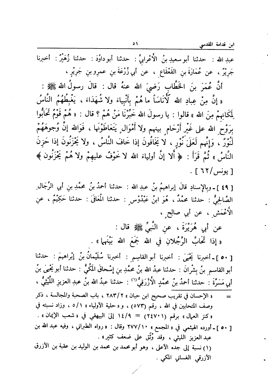 49 - وبالاستناد قَالَ إِبْرَاهِيم بن عبد الله حَدثنَا أَحْمد بن مُحَمَّد بن أبي الرِّجَال الصَّالِحِي حَدثنَا محمدهو ابْن عَبدُوس حَدثنَا الْمعَافى حَدثنَا حَكِيم عَن الْأَعْمَش عَن أبي صَالح