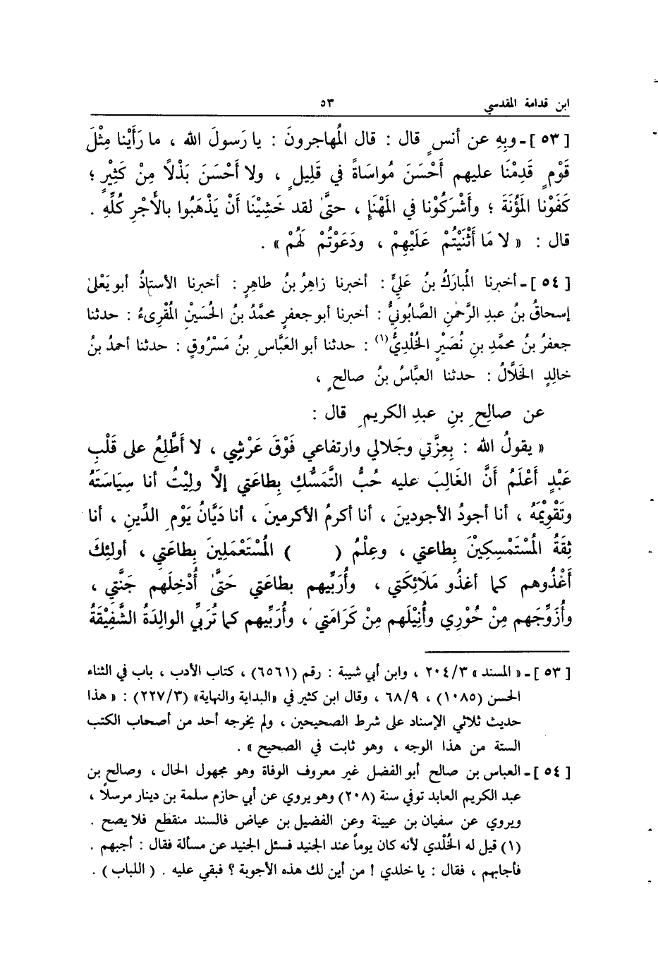 54 - أخبرنَا الْمُبَارك بن عَليّ أخبرنَا زَاهِر بن طَاهِر أخبرنَا الْأُسْتَاذ أَبُو يعلى إِسْحَاق بن عبد الرَّحْمَن الصَّابُونِي أخبرنَا أَبُو جَعْفَر مُحَمَّد بن الْحُسَيْن الْمُقْرِئ حَدثنَا جَعْفَر بن مُحَمَّد بن نصير الْخُلْدِيِّ حَدثنَا أَبُو عَبَّاس بن مَسْرُوق حَدثنَا أَحْمد بن خَالِد الْخلال حَدثنَا الْعَبَّاس بن صَالح