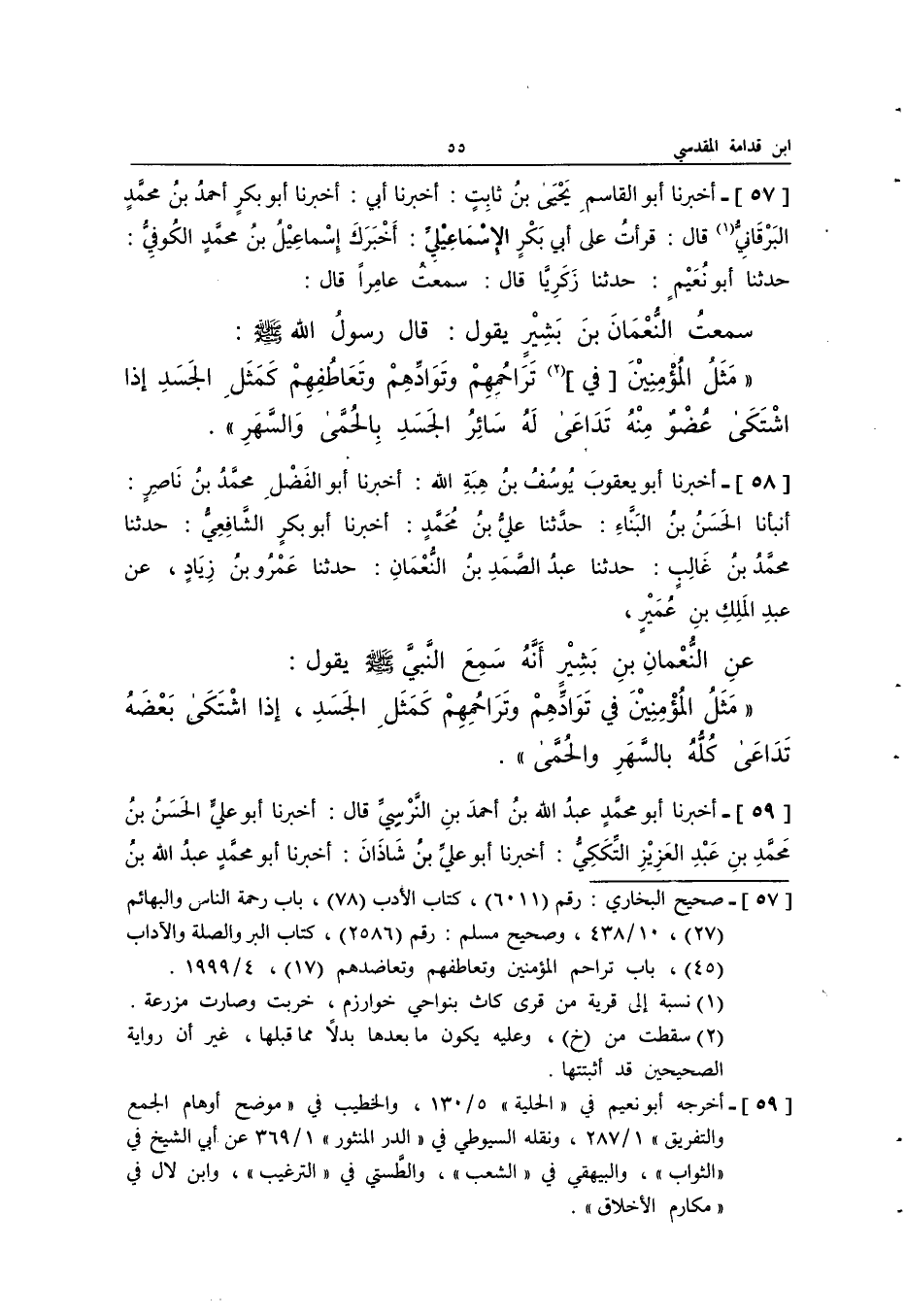 59 - أخبرنَا أَبُو مُحَمَّد عبد الله بن أَحْمد بن النَّرْسِي قَالَ أخبرنَا أَبُو عَليّ الْحسن بن مُحَمَّد بن عبد الْعَزِيز التككي أخبرنَا أَبُو عَليّ بن شَاذان أخبرنَا أَبُو مُحَمَّد عبد الله بن