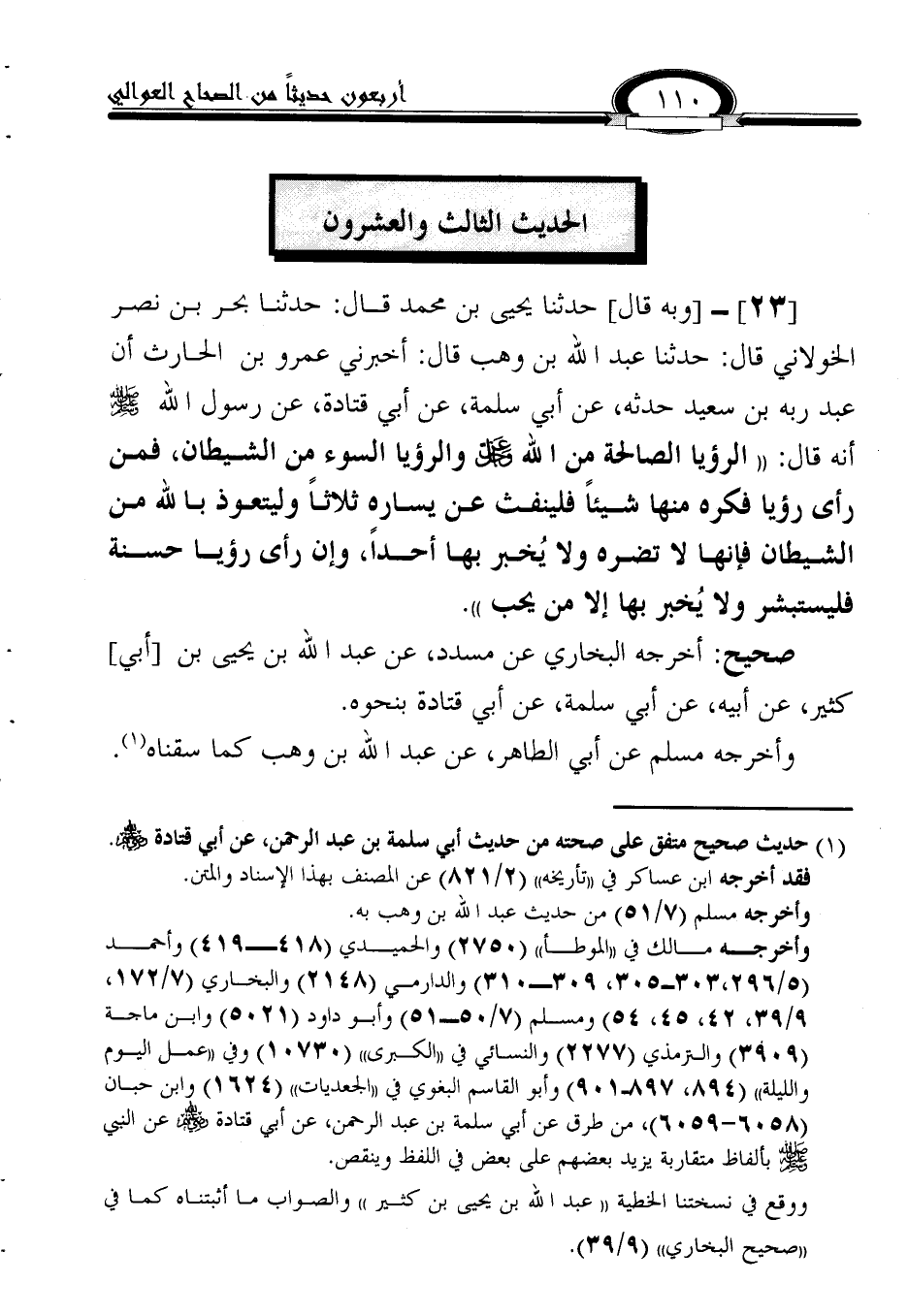 23 - [وبه قال] حدثنا يحيى بن محمد قال: حدثنا بحر بن نصر الخولاني قال: حدثنا عبد الله بن وهب قال: أخبرني عمرو بن الحارث أن عبد ربه بن سعيد حدثه، عن أبي سلمة، عن أبي قتادة، عن رسول الله صلى الله عليه وسلم أنه قال: ((الرؤيا الصالحة من الله عز وجل والرؤيا السوء من الشيطان، فمن رأى رؤيا فكره منها شيئاً فلينفث عن يساره ثلاثاً وليتعوذ بالله من الشيطان فإنها لا تضره ولا يخبر بها أحداً، وإن رأى رؤيا حسنة فليستبشر ولا يخبر بها إلا من يحب)).