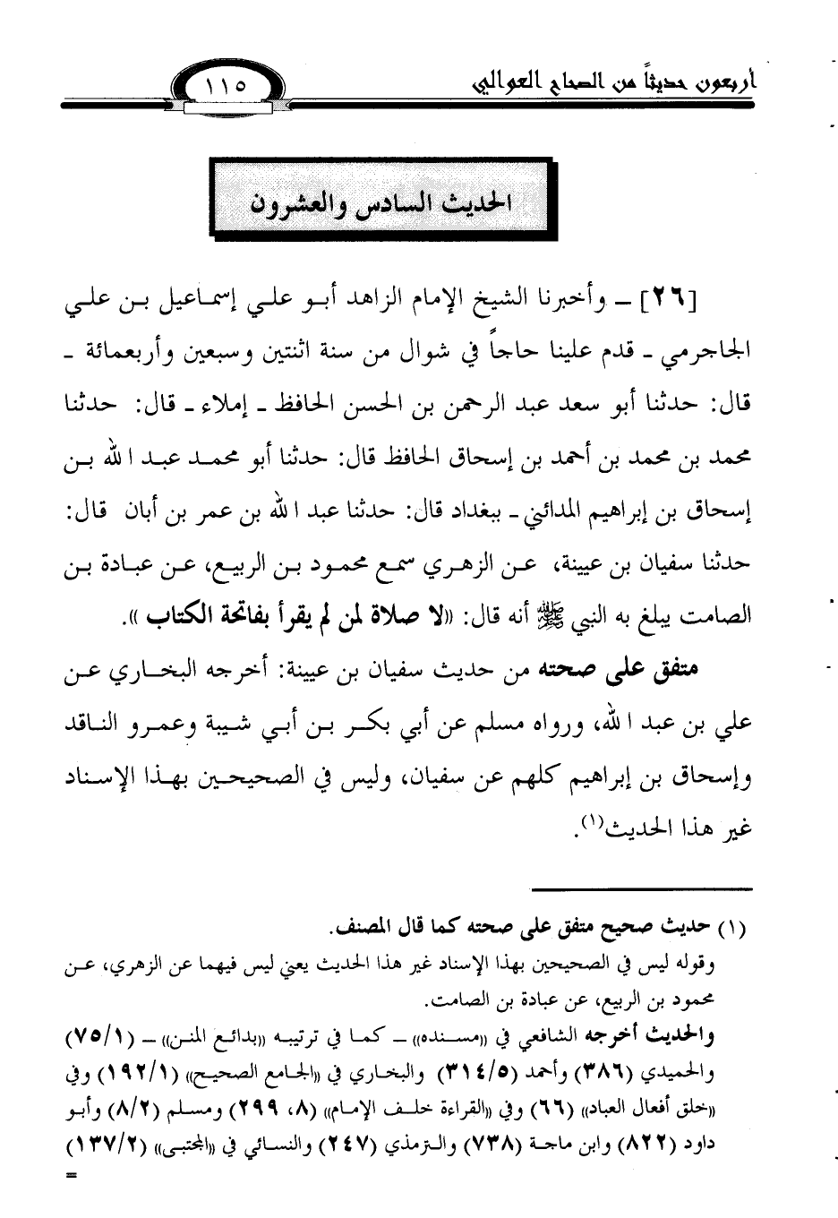 26 - وأخبرنا الشيخ الإمام الزاهد أبو علي إسماعيل بن علي الجاجرمي -قدم علينا حاجاً في شوال من سنة اثنتين وسبعين وأربعمائة- قال: حدثنا أبو سعد عبد الرحمن بن الحسن الحافظ إملاء قال: حدثنا محمد بن محمد بن أحمد بن إسحاق الحافظ قال: حدثنا أبو محمد عبد الله بن إسحاق بن إبراهيم المدائني ببغداد قال: حدثنا عبد الله بن عمر بن أبان قال: حدثنا سفيان بن عيينة، عن الزهري سمع محمود بن الربيع، عن عبادة بن الصامت يبلغ به النبي صلى الله عليه وسلم أنه قال: ((لا صلاة لمن لم يقرأ بفاتحة الكتاب)).