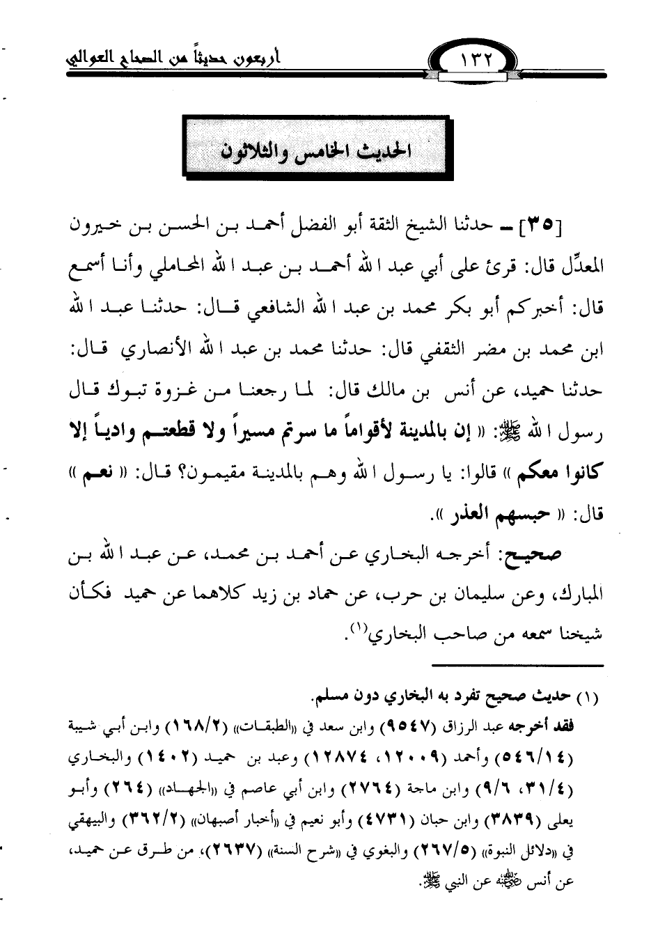 35 - حدثنا الشيخ الثقة أبو الفضل أحمد بن الحسن بن خيرون المعدل قال: قرئ على أبي عبد الله أحمد بن عبد المحاملي وأنا أسمع قال: أخبركم أبو بكر محمد بن عبد الله الشافعي قال: حدثنا عبد الله بن محمد بن مضر الثقفي قال: حدثنا محمد بن عبد الله الأنصاري قال: حدثنا حميد، عن أنس بن مالك قال: لما رجعنا من غزوة تبوك قال رسول الله صلى الله عليه وسلم: ((إن بالمدينة لأقواماً ما سرتم مسيراً ولا قطعتم وادياً إلا كانوا معكم)) قالوا: يا رسول الله وهم بالمدينة مقيمون؟ قال: ((نعم)) قال: ((حبسهم العذر)).