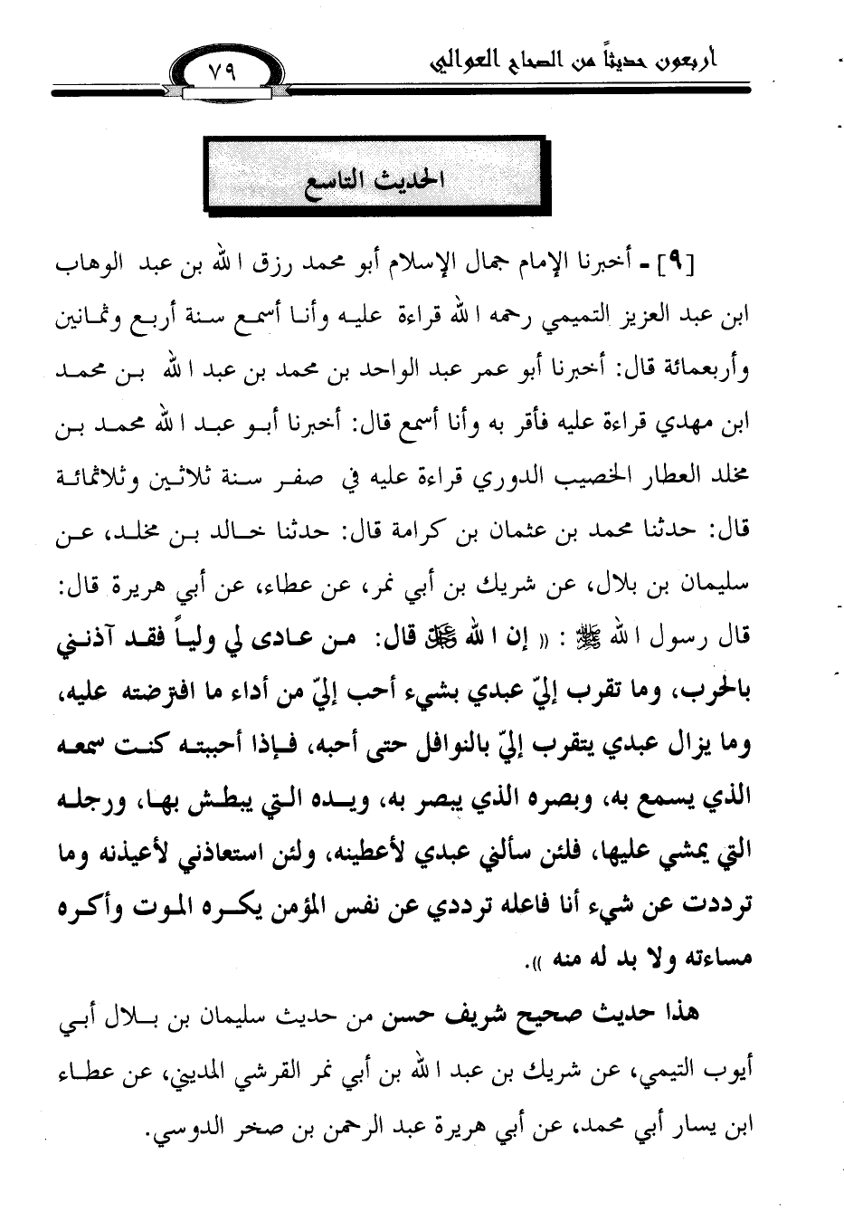 9 - أخبرنا الإمام جمال الإسلام أبو محمد رزق الله بن عبد الوهاب بن عبد العزيز التميمي رحمه الله قراءة عليه وأنا أسمع سنة أربع وثمانين وأربعمائة قال: أخبرنا أبو عمر عبد الواحد بن محمد بن عبد الله بن محمد بن مهدي قراءة عليه فأقر به وأنا أسمع قال: أخبرنا أبو عبد الله محمد بن مخلد العطار الخصيب الدوري قراءة عليه في صفر سنة ثلاثين وثلاثمائة قال: حدثنا محمد بن عثمان بن كرامة قال: حدثنا خالد بن مخلد، عن سليمان بن بلال، عن شريك بن أبي نمر، عن عطاء، عن أبي هريرة قال: قال رسول الله صلى الله عليه وسلم: ((إن الله عز وجل قال: من عادى لي ولياً فقد آذنني بالحرب، وما تقرب إلي عبدي بشيء أحب إلي من أداء ما افترضته عليه، وما يزال عبدي يتقرب إلي بالنوافل حتى أحبه، فإذا أحببته كنت سمعه الذي يسمع به، وبصره الذي يبصر به، ويده التي يبطش بها، ورجله التي يمشي عليها، فلئن سألني عبدي لأعطينه، ولئن استعاذني لأعيذنه وما ترددت عن شيء أنا فاعله ترددي عن نفس المؤمن يكره الموت وأكره مساءته ولا بد له منه)).