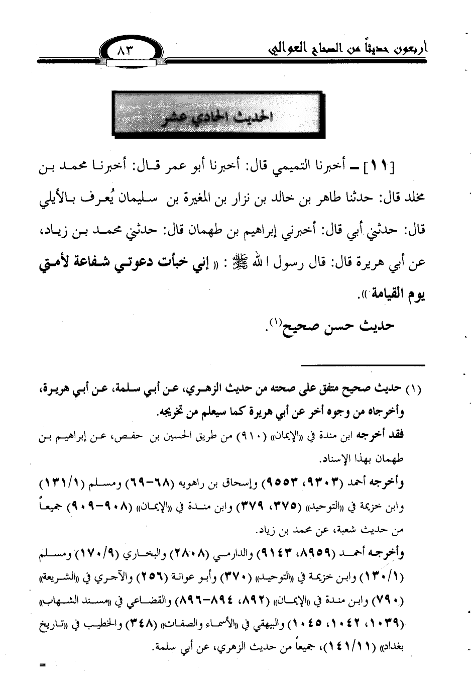 11 - أخبرنا التميمي قال: أخبرنا أبو عمر قال: أخبرنا محمد بن مخلد قال: حدثنا طاهر بن خالد بن نزار بن المغيرة بن سليمان يعرف بالأيلي قال: حدثني أبي قال: أخبرني إبراهيم بن طهمان قال: حدثني محمد بن زياد، عن أبي هريرة قال: قال رسول الله صلى الله عليه وسلم: ((إني خبأت دعوتي شفاعة لأمتي يوم القيامة)).