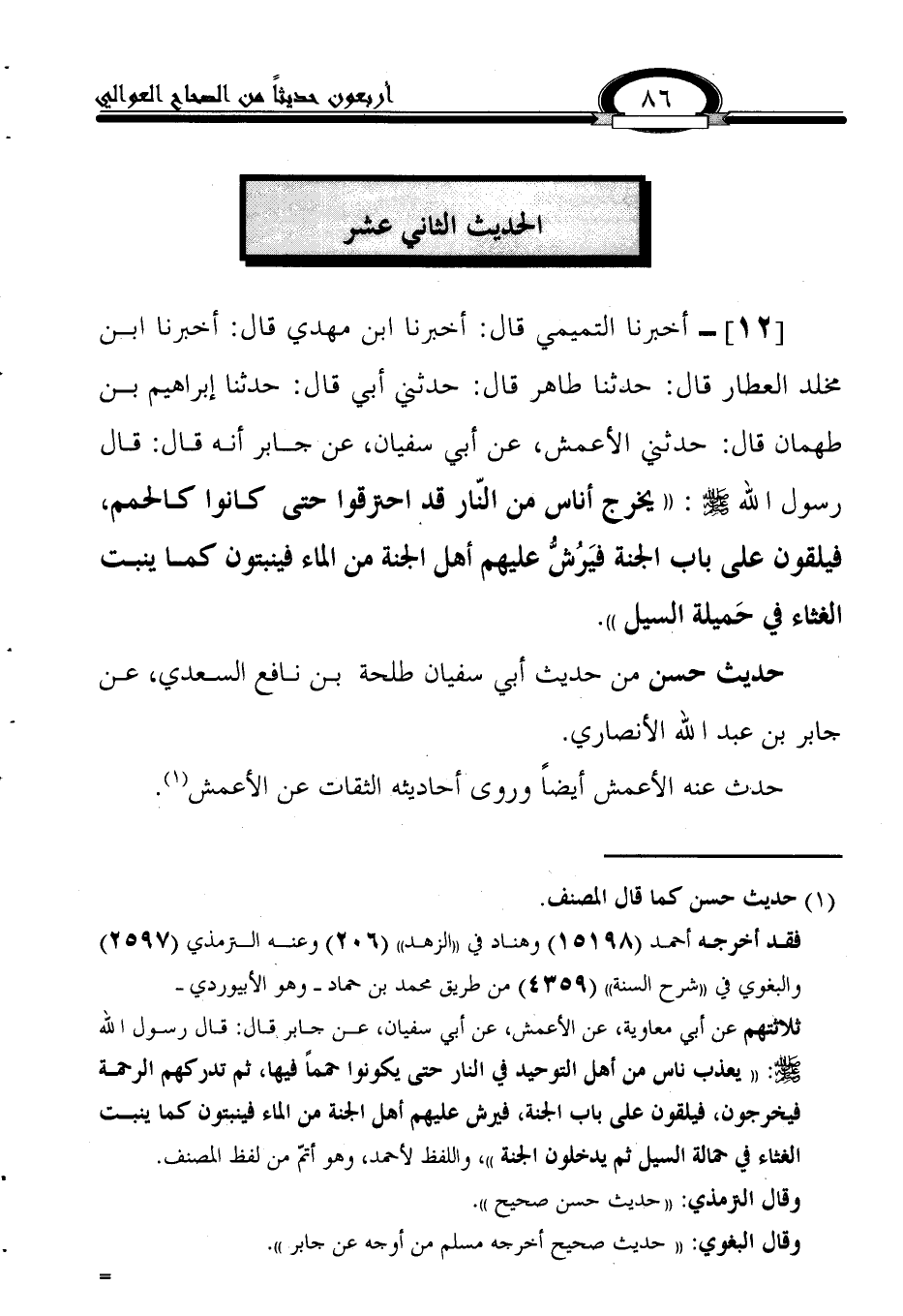 12 - أخبرنا التميمي قال: أخبرنا ابن مهدي قال: أخبرنا ابن مخلد العطار قال: حدثنا طاهر قال: حدثني أبي قال: حدثنا إبراهيم بن طهمان قال: حدثني الأعمش، عن أبي سفيان، عن جابر أنه قال: قال رسول الله صلى الله عليه وسلم: ((يخرج أناس من النار قد احترقوا حتى كانوا كالحمم، فيلقون على باب الجنة فيرش عليهم أهل الجنة من الماء فينبتون كما ينبت الغثاء في حميلة السيل)).
