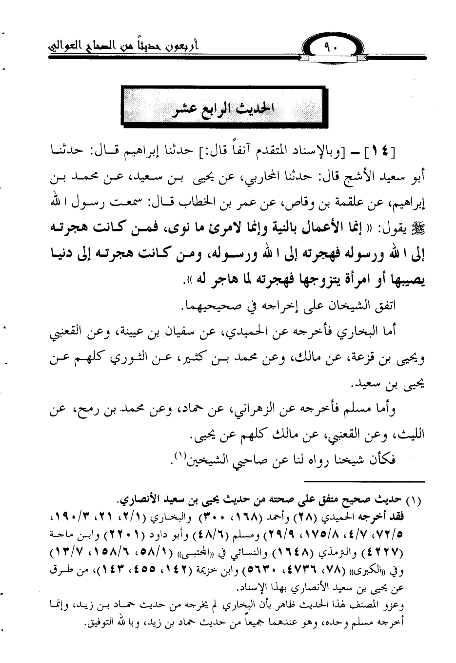14 - [وبالإسناد المتقدم آنفاً قال:] حدثنا إبراهيم قال: حدثنا أبو سعيد الأشج قال: حدثنا المحاربي، عن يحيى بن سعيد، عن محمد بن إبراهيم، عن علقمة بن وقاص، عن عمر بن الخطاب قال: سمعت رسول الله صلى الله عليه وسلم يقول: ((إنما الأعمال بالنية وإنما لامرئ ما نوى، فمن كانت هجرته إلى الله ورسوله فهجرته إلى الله ورسوله، ومن كانت هجرته إلى دنيا يصيبها أو امرأة يتزوجها فهجرته لما هاجر له)).