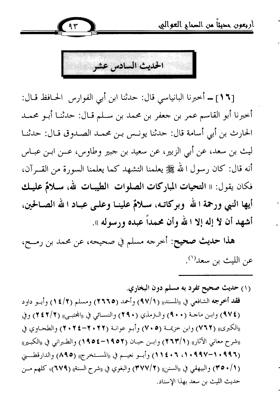 16 - أخبرنا البانياسي قال: حدثنا ابن أبي الفوارس الحافظ قال: أخبرنا أبو القاسم عمر بن جعفر بن محمد بن سلم قال: حدثنا أبو محمد الحارث بن أبي أسامة قال: حدثنا يونس بن محمد الصدوق قال: حدثنا ليث بن سعد، عن أبي الزبير، عن سعيد بن جبير وطاوس، عن ابن عباس أنه قال: كان رسول الله صلى الله عليه وسلم يعلمنا التشهد كما يعلمنا السورة من القرآن، فكان يقول: ((التحيات المباركات الصلوات الطيبات لله، سلامٌ عليك أيها النبي ورحمة الله وبركاته، سلامٌ علينا وعلى عباد الله الصالحين، أشهد أن لا إله إلا الله وأن محمداً عبده ورسوله)).