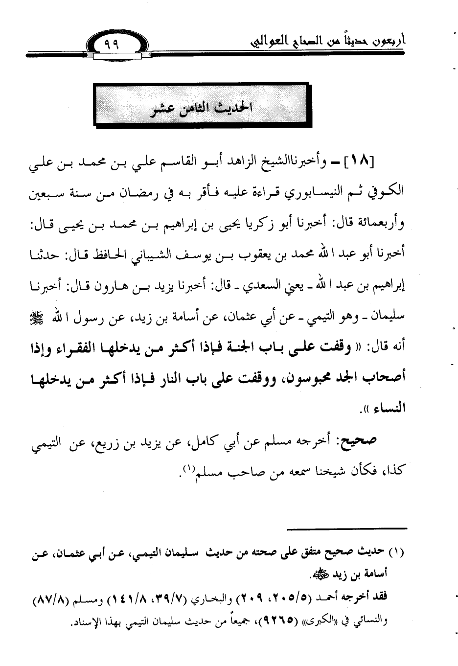 18 - وأخبرنا الشيخ الزاهد أبو القاسم علي بن محمد بن علي الكوفي ثم النيسابوري قراءة عليه فأقر به في رمضان من سنة سبعين وأربعمائة قال: أخبرنا أبو زكريا يحيى بن إبراهيم بن محمد بن يحيى قال: أخبرنا أبو عبد الله محمد بن يعقوب بن يوسف الشيباني الحافظ قال: حدثنا إبراهيم بن عبد الله -يعني السعدي- قال: أخبرنا يزيد بن هارون قال: أخبرنا سليمان -وهو التيمي- عن أبي عثمان، عن أسامة بن زيد، عن رسول الله صلى الله عليه وسلم أنه قال: ((وقفت على باب الجنة فإذا أكثر من يدخلها الفقراء وإذا أصحاب الجد محبوسون، ووقفت على باب النار فإذا أكثر من يدخلها النساء)).