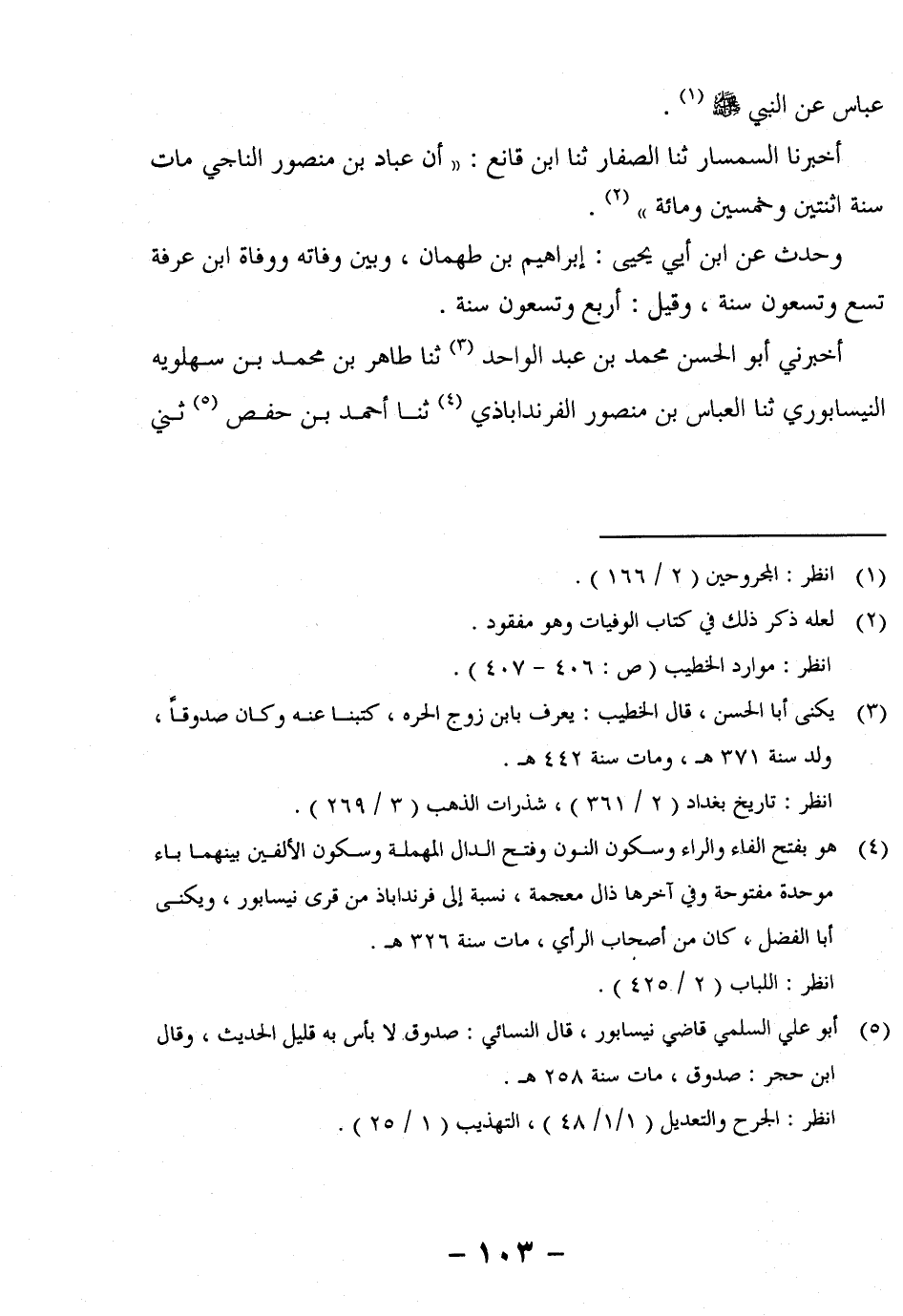 أَخْبَرَنِي أَبُو الْحَسَنِ مُحَمَّدُ بْنُ عَبْدِ الْوَاحِدِ3 ثنا طَاهِرُ بْنُ مُحَمَّدِ بْنِ سَهْلُوَيْهِ النَّيْسَابُورِيُّ ثنا الْعَبَّاسُ بْنُ مَنْصُورٍ الفَرَنْدَابَاذِيُّ4 ثنا أحمد بن حفص5 ثني