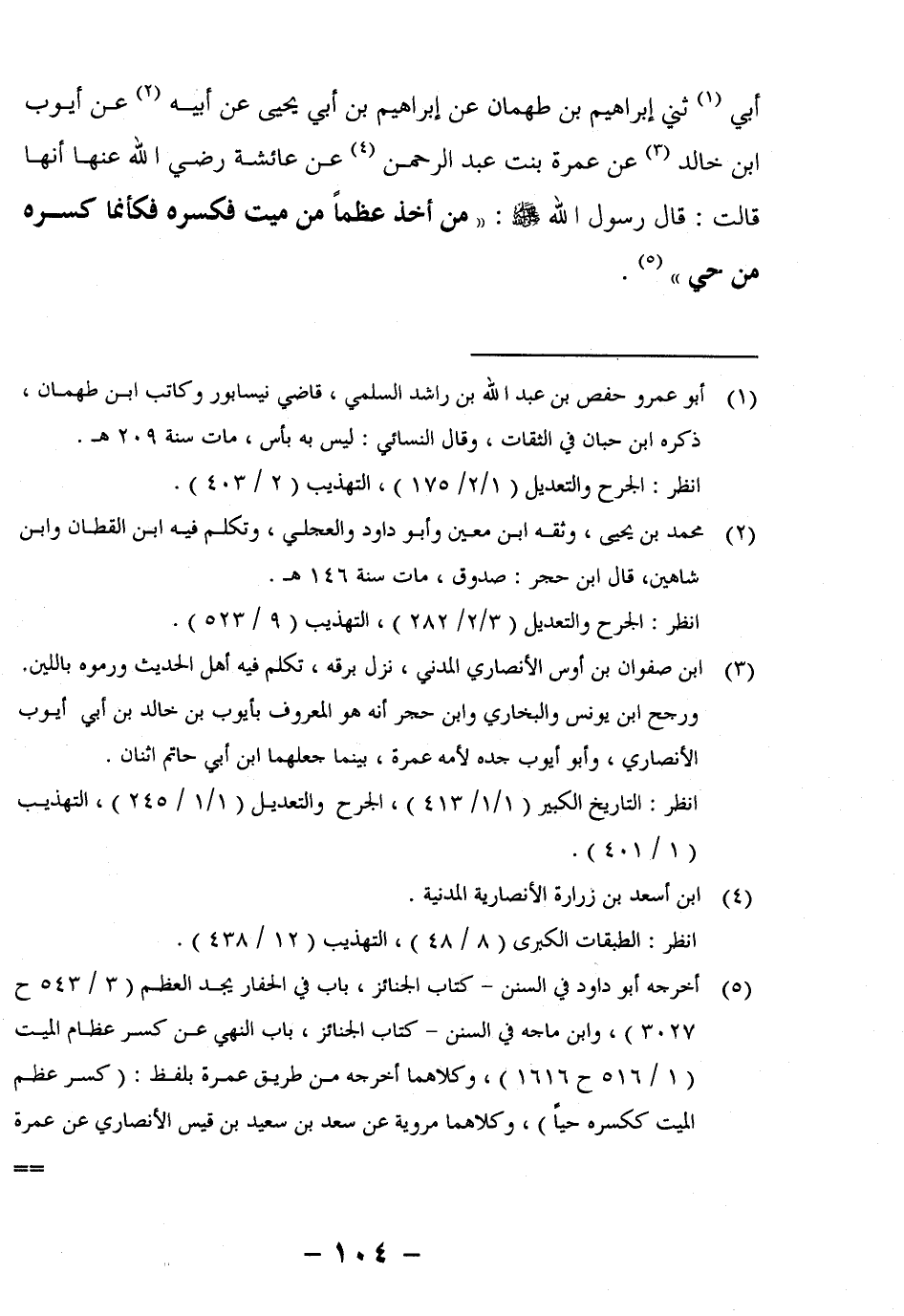 أَبِي1 ثني إِبْرَاهِيمُ بْنُ طَهْمَانَ عَنْ إِبْرَاهِيمَ بْنِ أَبِي يَحْيَى عَنْ أَبِيهِ2 عَنْ أَيُّوبَ بْنِ خَالِدٍ3 عَنْ عَمْرَةَ بِنْتِ عَبْدِ الرَّحْمَنِ4 عَنْ عَائِشَةَ رَضِيَ اللَّهُ عَنْهَا أَنَّهَا قَالَتْ: قَالَ رَسُولُ اللَّهِ صَلَّى اللَّهُ عَلَيْهِ وَسَلَّمَ: "مَنْ أَخَذَ عَظْمًا مِنْ مَيِّتٍ فَكَسَرَهُ فَكَأَنَّمَا كسره من حي" 5.