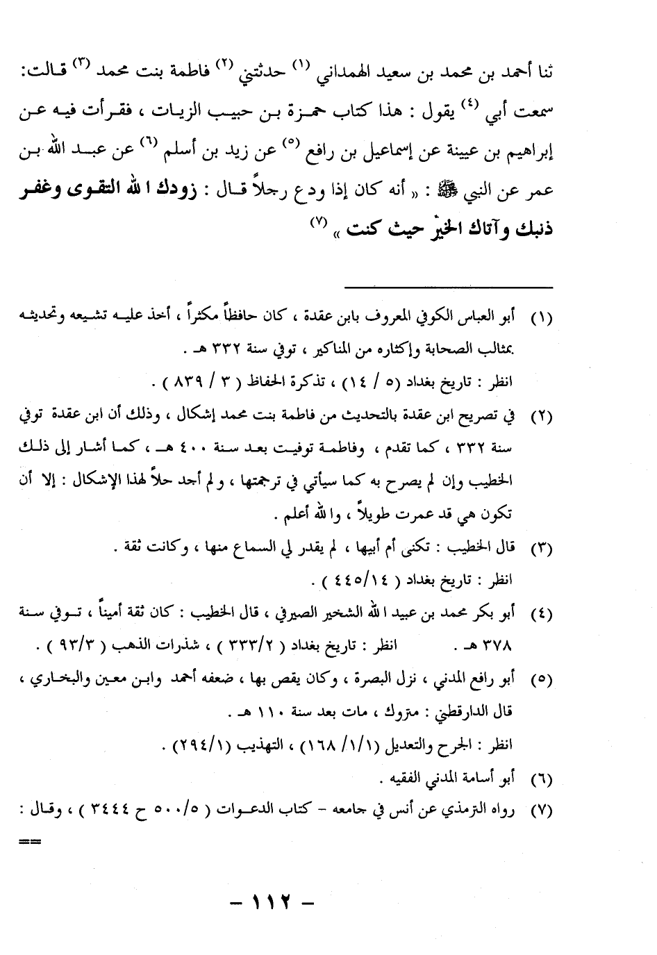 ثنا أَحْمَدُ بْنُ مُحَمَّدِ بْنِ سَعِيدٍ الْهَمْدَانِيُّ1 حَدَّثَتْنِي2 فَاطِمَةُ بِنْتُ مُحَمَّدٍ3 قَالَتْ: سَمِعْتُ أَبِي4 يَقُولُ: هَذَا كِتَابُ حَمْزَةَ بْنِ حَبِيبٍ الزَّيَّاتِ، فَقَرَأْتُ فِيهِ عَنْ إِبْرَاهِيمَ بْنِ عُيَيْنَةَ عَنْ إِسْمَاعِيلَ بْنِ رَافِعٍ5 عَنْ زَيْدِ بْنِ أَسْلَمَ6 عَنْ عَبْدِ اللَّهِ بْنِ عُمَرَ عَنِ النَّبِيِّ صَلَّى اللَّهُ عَلَيْهِ وَسَلَّمَ: "أَنَّهُ كَانَ إِذَا وَدَّعَ رَجُلا قَالَ: زَوَّدَكَ اللَّهُ التَّقْوَى وَغَفَرَ ذنبك وآتاك الخير حيث كنت" 7.