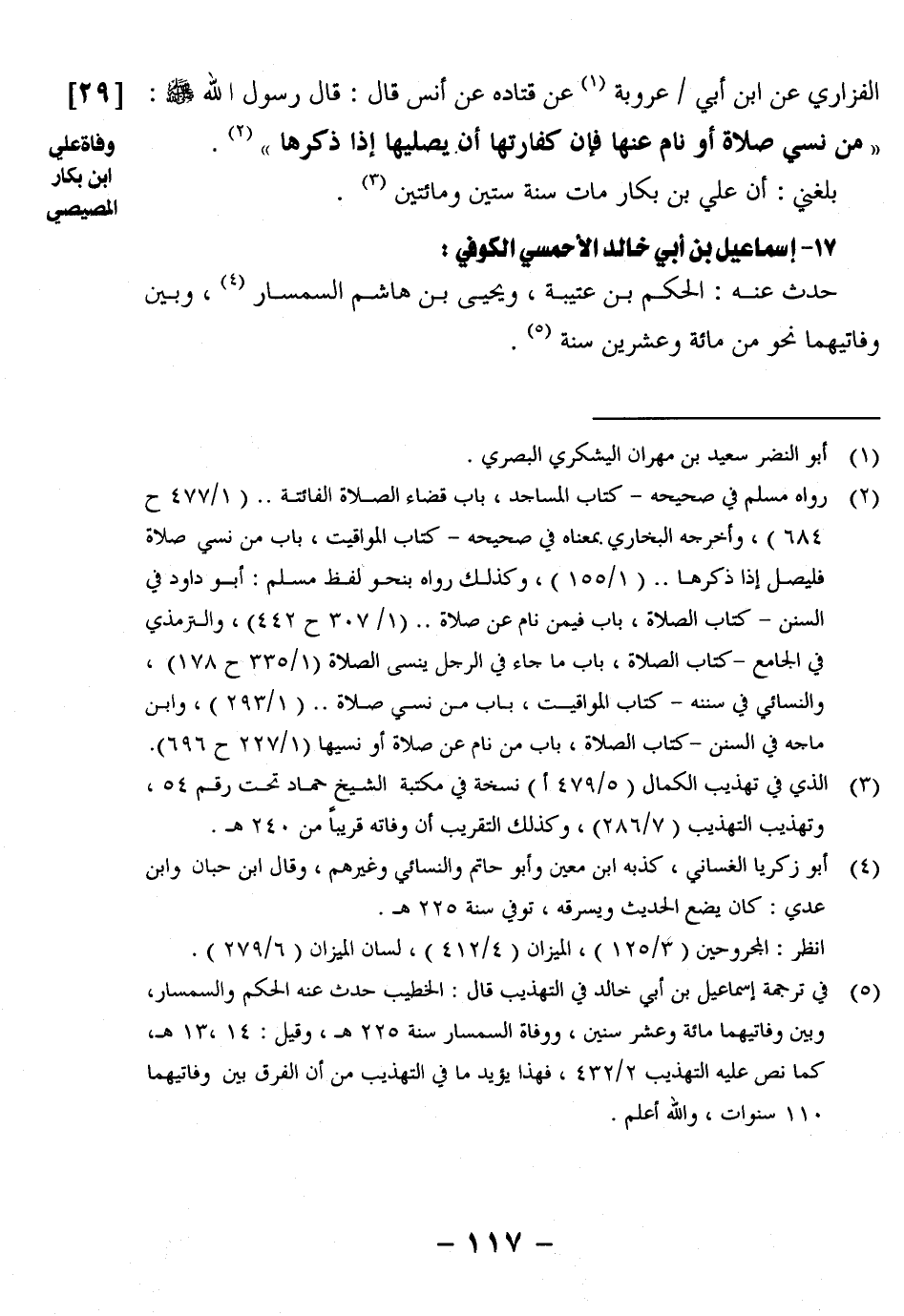 5 في ترجمة إسماعيل بن أبي خالد في التهذيب قال الخطيب: حدث عنه الحكم والسمسار، وبين وفاتيهما مائة وعشر سنين، ووفاة السمسار سنة 225هـ، وقيل: 14، 13، هـ، كما نص عليه التهذيب 2/432، فهذا يؤيد ما في التهذيب من أن الفرق بين وفاتيهما 110 سنوات، والله أعلم.