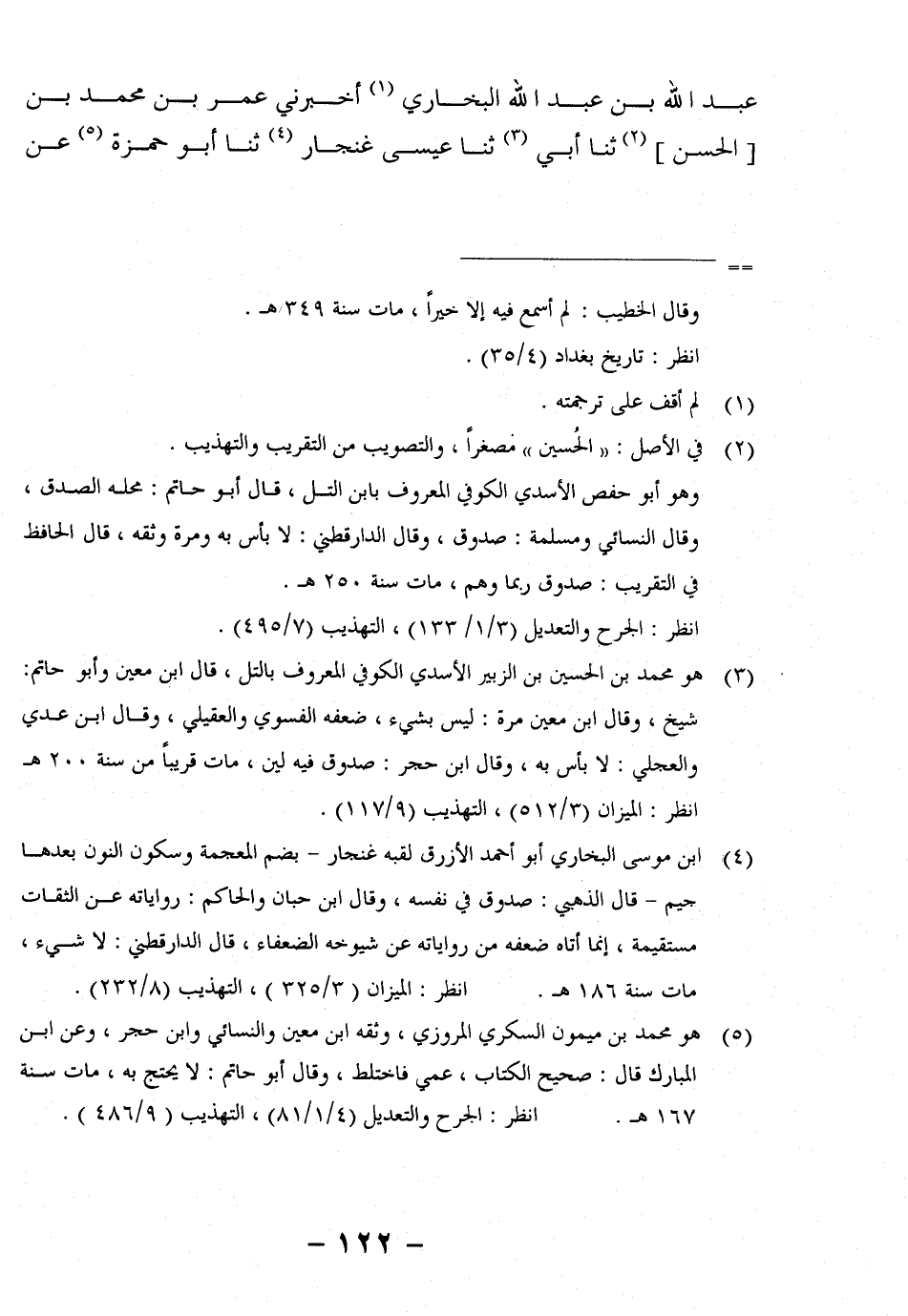 عَبْدُ اللَّهِ بْنُ عَبْدِ اللَّهِ الْبُخَارِيُّ1 أَخْبَرَنِي عُمَرُ بْنُ مُحَمَّدِ بْنِ [الْحَسَنِ] 2 ثنا أَبِي3 ثنا عِيسَى غُنْجَارُ4 ثنا أَبُو حَمْزَةَ5 عَنْ