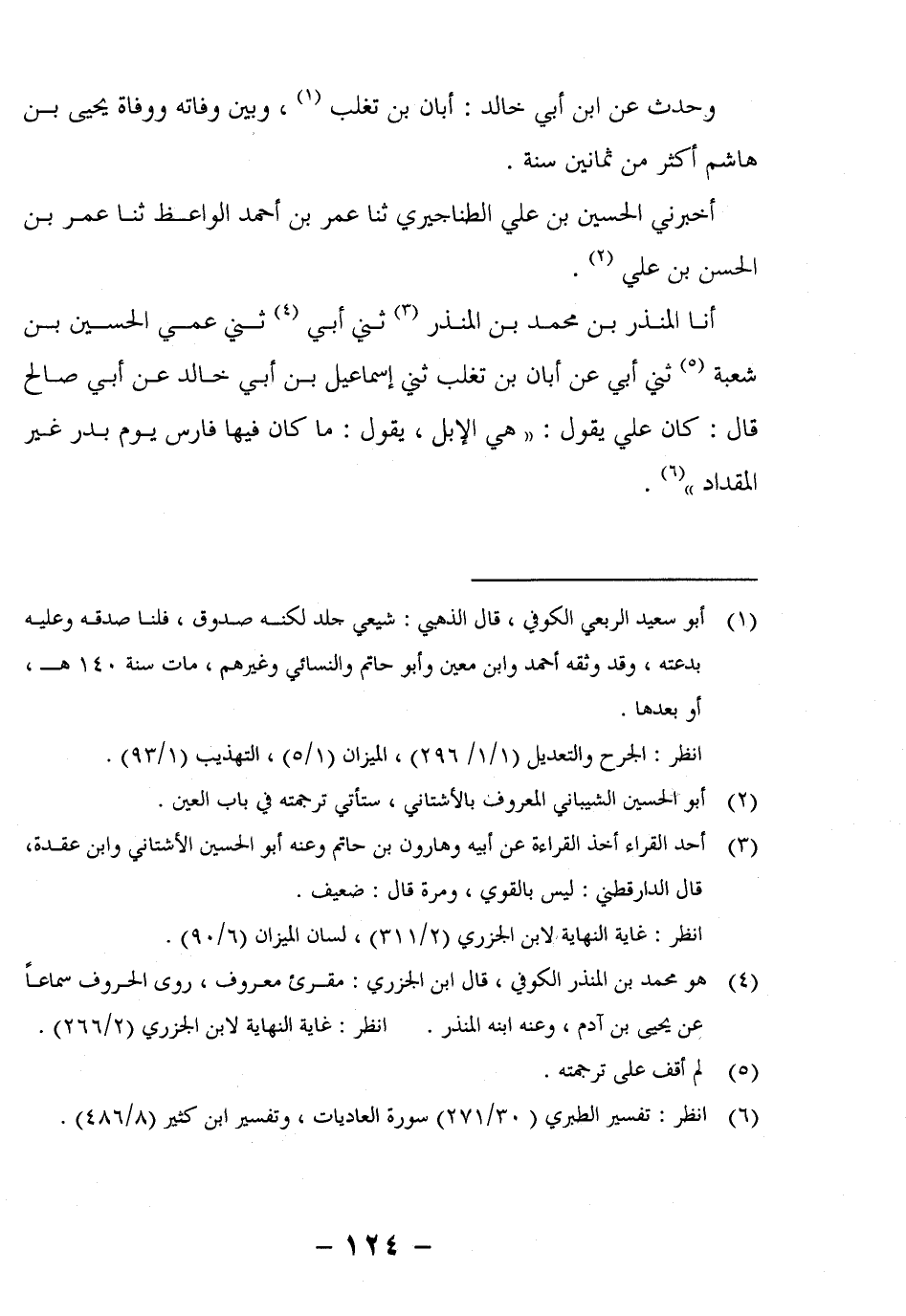 أنا الْمُنْذِرُ بْنُ مُحَمَّدِ بْنِ الْمُنْذِرِ3 ثني أَبِي4 ثني عَمِّي الْحُسَيْنُ بْنُ شُعْبَةَ5 ثني أَبِي عَنْ أَبَانِ بْنِ تَغْلِبَ ثني إِسْمَاعِيلُ بْنُ أَبِي خَالِدٍ عَنْ أَبِي صَالِحٍ قَالَ: كَانَ عَلِيٌّ يَقُولُ: "هِيَ الإِبِلُ، يَقُولُ: مَا كَانَ فِيهَا فَارِسٌ يَوْمَ بدر غير المقداد"6.