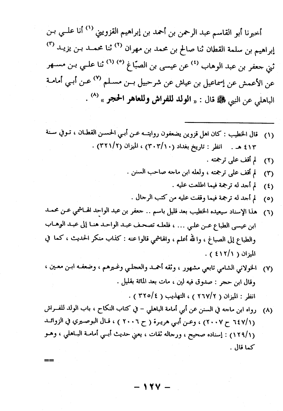 أَخْبَرَنَا أَبُو الْقَاسِمِ عَبْدُ الرَّحْمَنِ بْنُ أَحْمَدَ بْنِ إِبْرَاهِيمَ الْقَزْوِينِيُّ1 أنا عَلِيُّ بْنُ إِبْرَاهِيمَ بْنِ سَلَمَةَ الْقَطَّانُ ثنا صَالِحُ بْنُ مُحَمَّدِ بْنِ مِهْرَانَ2 ثنا مُحَمَّدُ بْنُ يَزِيدَ3 ثني جَعْفَرُ بْنُ عَبْدِ الْوَهَّابِ4 عَنْ عِيسَى بْنِ الصَّبَّاغِ5 6 ثنا عَلِيُّ بْنُ مُسْهِرٍ عَنِ الأَعْمَشِ عَنْ إِسْمَاعِيلَ بْنِ عَيَّاشٍ عَنْ شُرَحْبِيلَ بْنِ مُسْلِمٍ7 عَنْ أَبِي أُمَامَةَ الْبَاهِلِيِّ عَنِ النَّبِيِّ صَلَّى اللَّهُ عَلَيْهِ وَسَلَّمَ قَالَ: "الْوَلَدُ لِلْفِرَاشِ وللعاهر الحجر" 8.