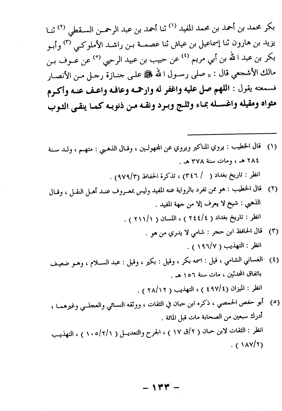 بَكْرٍ مُحَمَّدُ بْنُ أَحْمَدَ بْنِ مُحَمَّدٍ الْمُفِيدُ1 ثنا أَحْمَدُ بْنُ عَبْدِ الرَّحْمَنِ السَّقَطِيُّ2 ثنا يَزِيدُ بْنُ هَارُونَ ثنا إِسْمَاعِيلُ بْنُ عَيَّاشٍ ثنا عِصْمَةُ بْنُ رَاشِدٍ الأُمْلُوكِيُّ3 وَأَبُو بَكْرِ بْنُ عَبْدِ اللَّهِ بْنِ أَبِي مَرْيَمَ4 عَنْ حَبِيبِ بْنِ عُبَيْدٍ الرَّحْبِيِّ5 عَنْ عَوْفِ بْنِ مالك الأشجعي قال: "صلى الله رَسُولُ اللَّهِ صَلَّى اللَّهُ عَلَيْهِ وَسَلَّمَ عَلَى جِنَازَةِ رَجُلٍ مِنَ الأَنْصَارِ فَسَمِعْتُهُ يَقُولُ: اللَّهُمَّ صَلِّ عَلَيْهِ وَاغْفِرْ لَهُ وَارْحَمْهُ وَعَافِهِ وَاعْفُ عَنْهُ وَأَكْرِمْ مَثْوَاهُ وَمَقِيلَهُ وَاغْسِلْهُ بِمَاءٍ وَثَلْجٍ وَبَرَدٍ وَنَقِّهِ مِنْ ذُنُوبِهِ كَمَا يُنَقَّى الثَّوْبُ