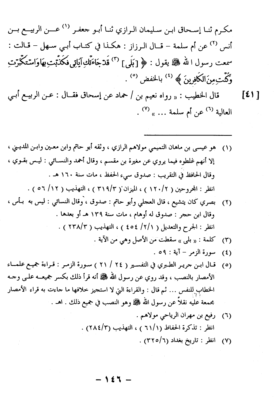 مُكْرَمٍ ثنا إِسْحَاقُ بْنُ سُلَيْمَانَ الرَّازِيُّ ثنا أَبُو جَعْفَرٍ1 عَنِ الرَّبِيعِ بْنِ أَنَسٍ2 عَنْ أُمِّ سَلَمَةَ – قَالَ الرَّزَّازُ: هَكَذَا فِي كِتَابِ أَبِي سَهْلٍ – قَالَتْ: سَمِعْتُ رَسُولَ اللَّهِ صَلَّى اللَّهُ عَلَيْهِ وَسَلَّمَ يَقُولُ: { [بَلَى] 3 قَدْ جَاءَتْكَ آيَاتِي فَكَذَّبْتَ بِهَا وَاسْتَكْبَرْتَ وَكُنْتَ مِنَ الْكَافِرِينَ} 4 بِالْخَفْضِ5.