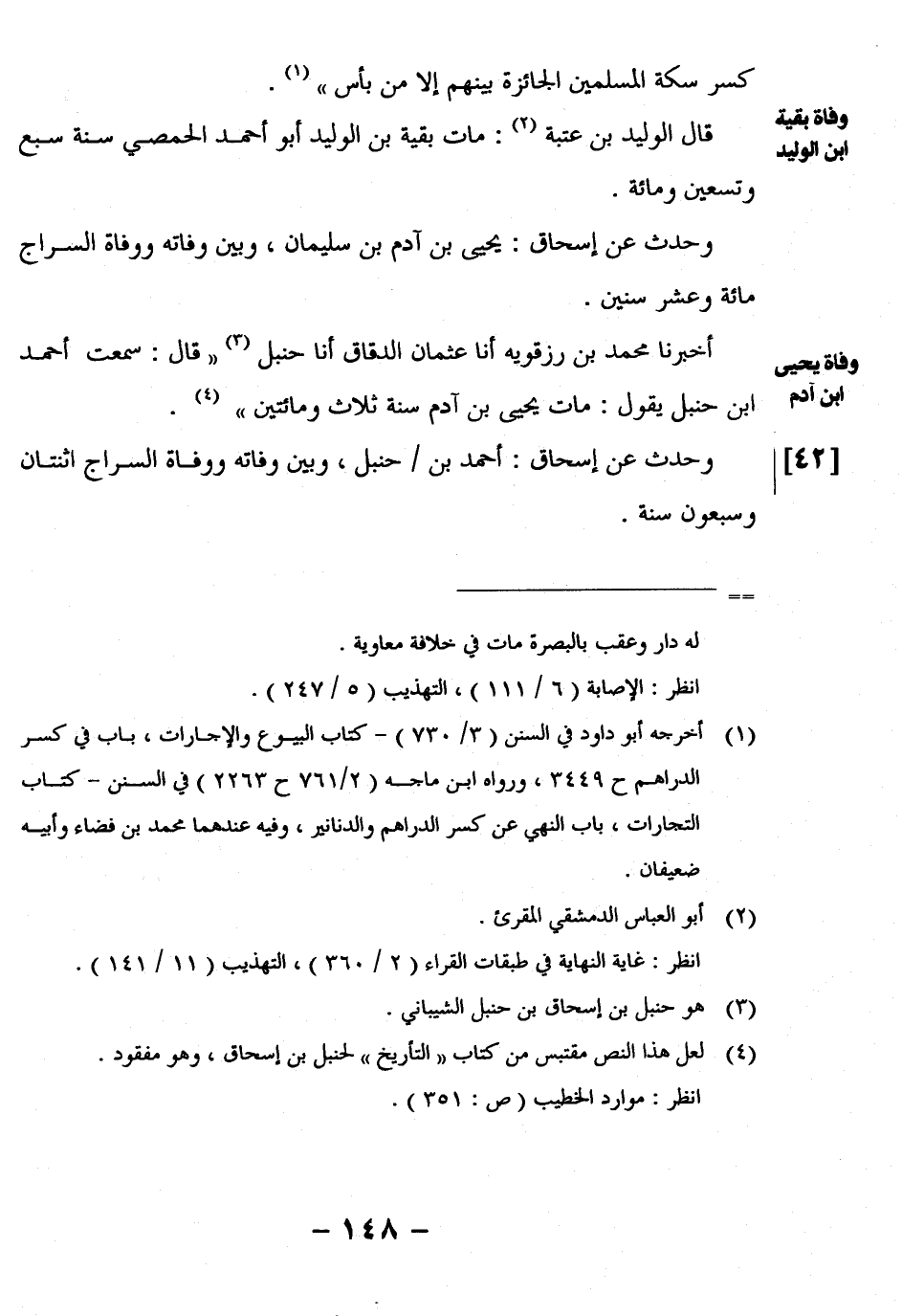 أَخْبَرَنَا مُحَمَّدُ بْنُ رِزْقُوَيْهِ أنا عُثْمَانُ الدَّقَّاقُ أنا حنبل3 "قال: سمعت أحمد ابن حَنْبَلٍ يَقُولُ: مَاتَ يَحْيَى بْنُ آدَمَ سَنَةَ ثَلاثٍ وَمِائَتَيْنِ"4.