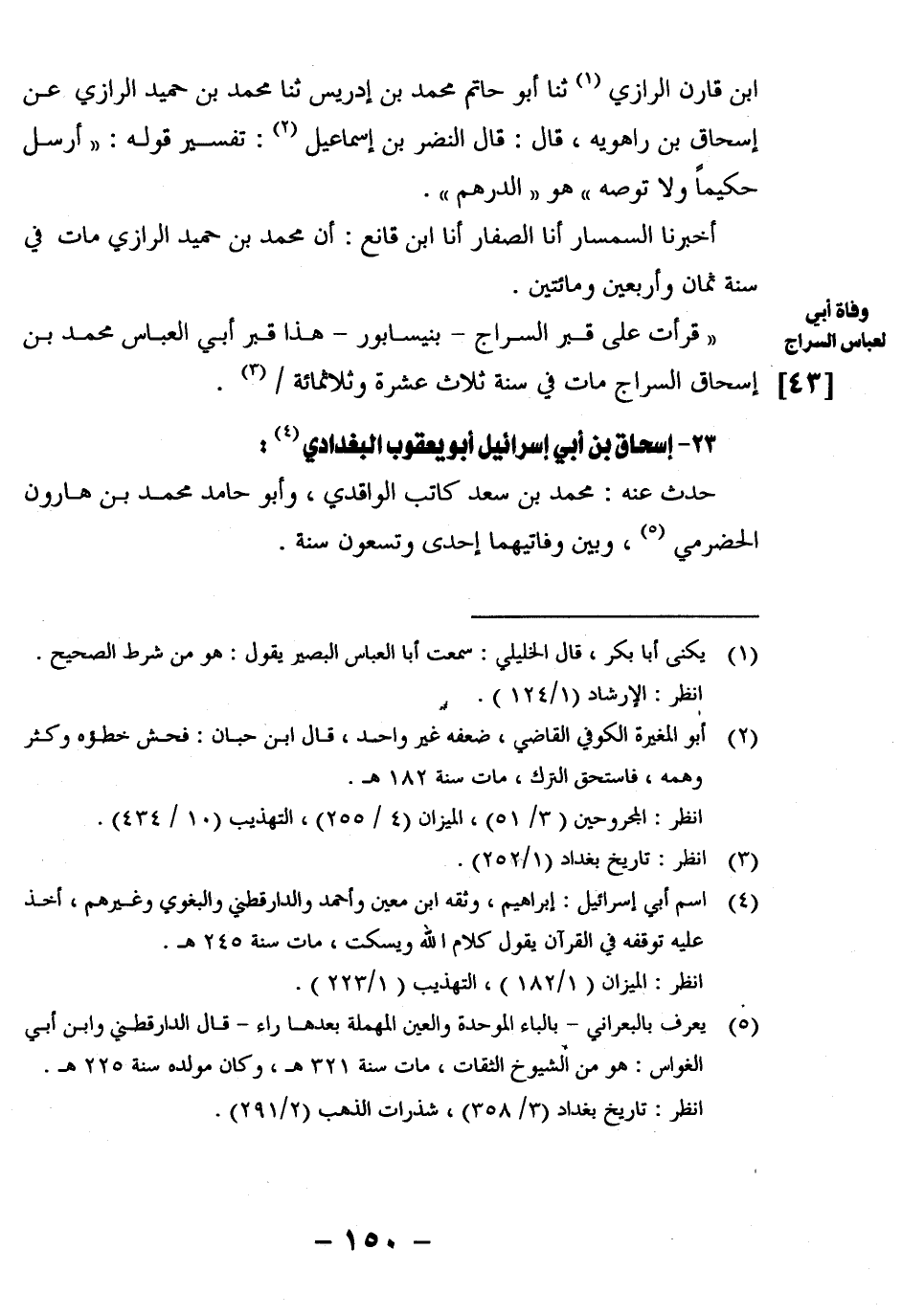 "قَرَأْتُ عَلَى قَبْرِ السَّرَّاجِ – بِنَيْسَابُورَ – هَذَا قَبْرُ أَبِي الْعَبَّاسِ مُحَمَّدِ بْنِ إِسْحَاقَ السَّرَّاجِ مَاتَ فِي سَنَةِ ثلاث عشرة وثلاثمائة/3.