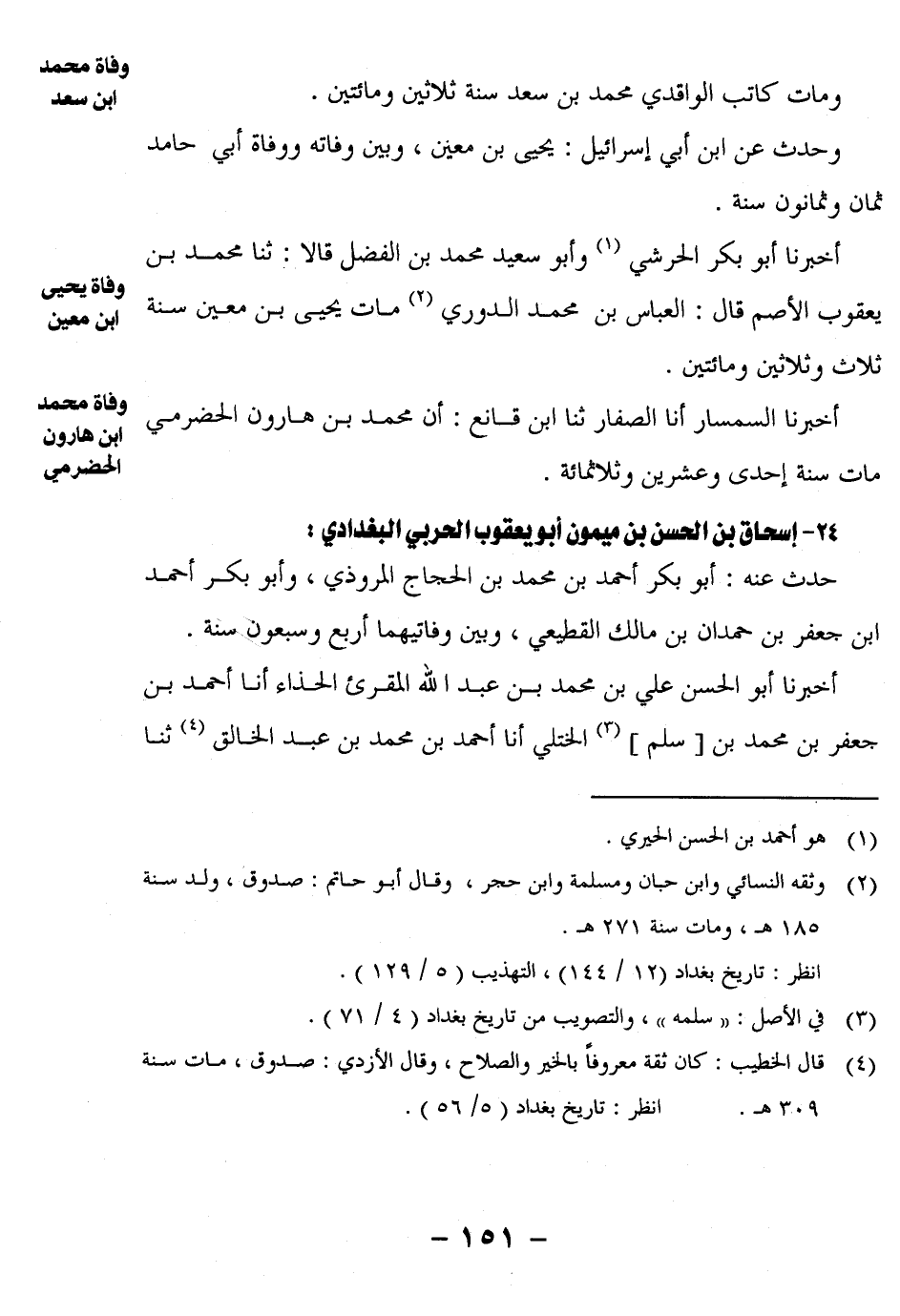 4 قال الخطيب: كان ثقة معروفاً بالخير والصلاح، وقال الأزدي: صدوق، مات سنة 309 هـ، انظر: تاريخ بغداد 5/56.