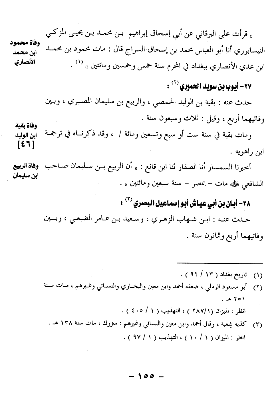 "قَرَأْتُ عَلَى الْبَرْقَانِيِّ عَنْ أَبِي إِسْحَاقَ إِبْرَاهِيمَ بْنِ مُحَمَّدِ بْنِ يَحْيَى الْمُزَكِّي النَّيْسَابُورِيِّ أنا أَبُو الْعَبَّاسِ مُحَمَّدُ بْنُ إِسْحَاقَ السَّرَّاجُ قَالَ: مَاتَ مَحْمُودُ بْنُ مُحَمَّدِ بْنِ عَدِيٍّ الأَنْصَارِيُّ بِبَغْدَادَ فِي الْمُحَرَّمِ سَنَةَ خَمْسٍ وَخَمْسِينَ وَمِائَتَيْنِ"1.