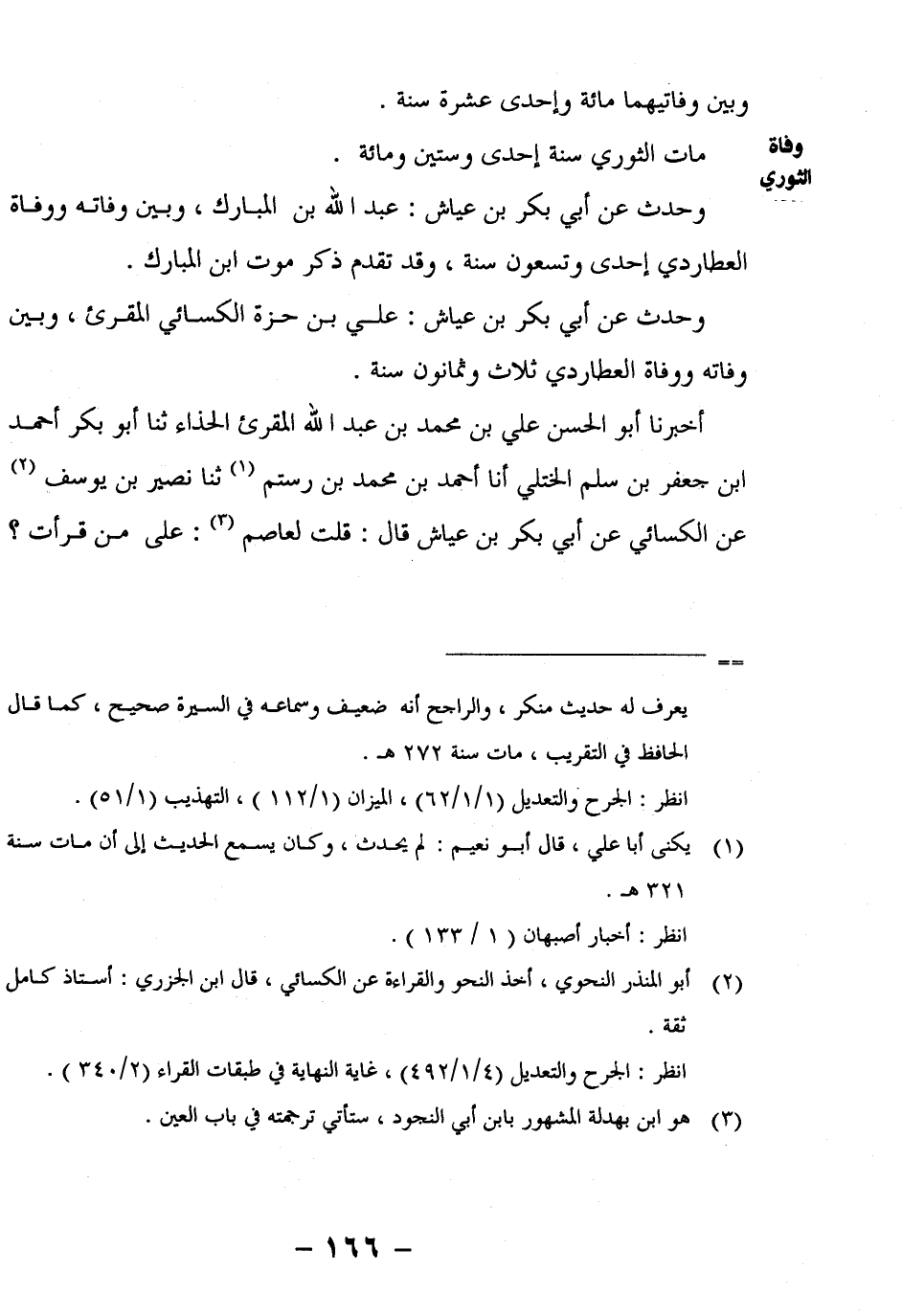 وَحَدَّثَ عَنْ أَبِي بَكْرِ بْنِ عَيَّاشٍ: عَلِيُّ بْنُ حَمْزَةَ الْكِسَائِيُّ الْمُقْرِئُ، وَبَيْنَ وَفَاتِهِ وَوَفَاةِ الْعُطَارِدِيِّ ثَلاثٌ وَثَمَانُونَ سَنَةً.