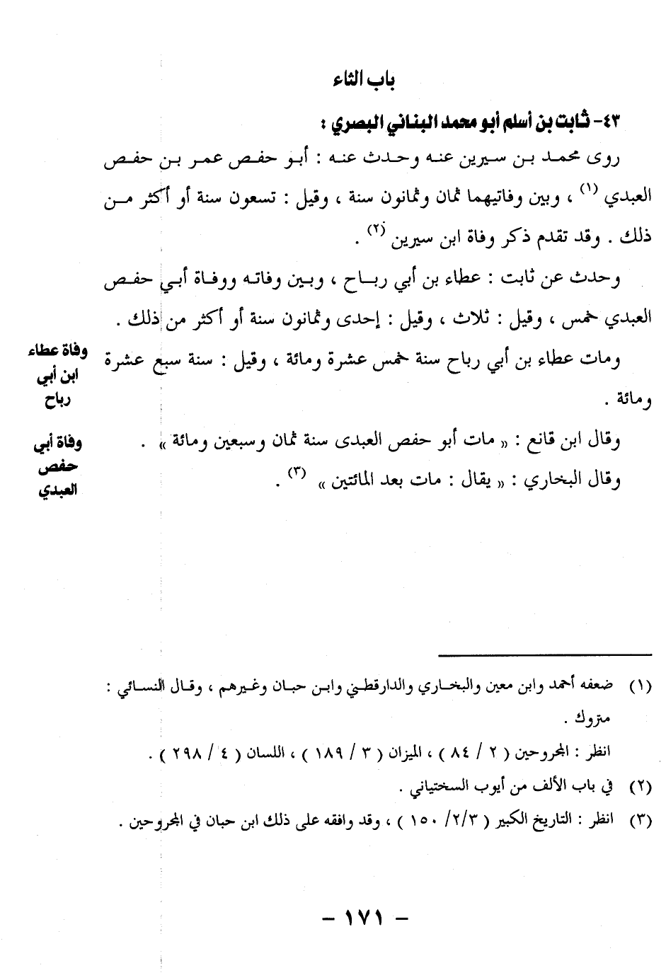43- ثَابِتُ بْنُ أَسْلَمَ أَبُو مُحَمَّدٍ الْبُنَانِيُّ الْبَصْرِيُّ: