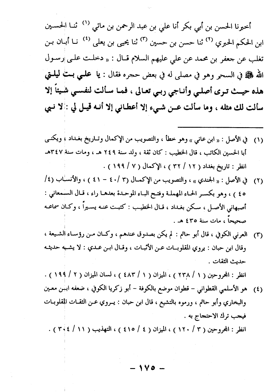 أَخْبَرَنَا الْحَسَنُ بْنُ أَبِي بَكْرٍ أنا عَلِيُّ بْنُ عَبْدِ الرَّحْمَنِ بْنِ مَاتِي1 ثنا الْحُسَيْنُ بْنُ الْحَكَمِ الْحِبْرِيُّ2 ثنا حَسَنُ بْنُ حُسَيْنٍ3 ثنا يَحْيَى بْنُ يَعْلَى4 نا أَبَانُ بْنُ تَغْلِبَ عَنْ جَعْفَرِ بْنِ مُحَمَّدٍ عَنْ عَلِيٍّ عَلَيْهِمُ السَّلامُ قَالَ: "دَخَلْتُ عَلَى رَسُولِ اللَّهِ صَلَّى اللَّهُ عَلَيْهِ وَسَلَّمَ فِي السَّحَرِ وَهُوَ فِي مُصَلًّى لَهُ فِي بَعْضِ حُجَرِهِ فَقَالَ: يَا عَلِيُّ بِتُّ لَيْلَتِي هَذِهِ حَيْثُ تَرَى أُصَلِّي وَأُنَاجِي رَبِّي تَعَالَى، فَمَا سَأَلْتُ لِنَفْسِي شَيْئًا إِلا سَأَلْتُ لَكَ مِثْلَهُ، وَمَا سَأَلْتُ عَنْ شَيْءٍ إِلا أَعْطَانِي إِلا أَنَّهُ قِيلَ لي: لا نبي