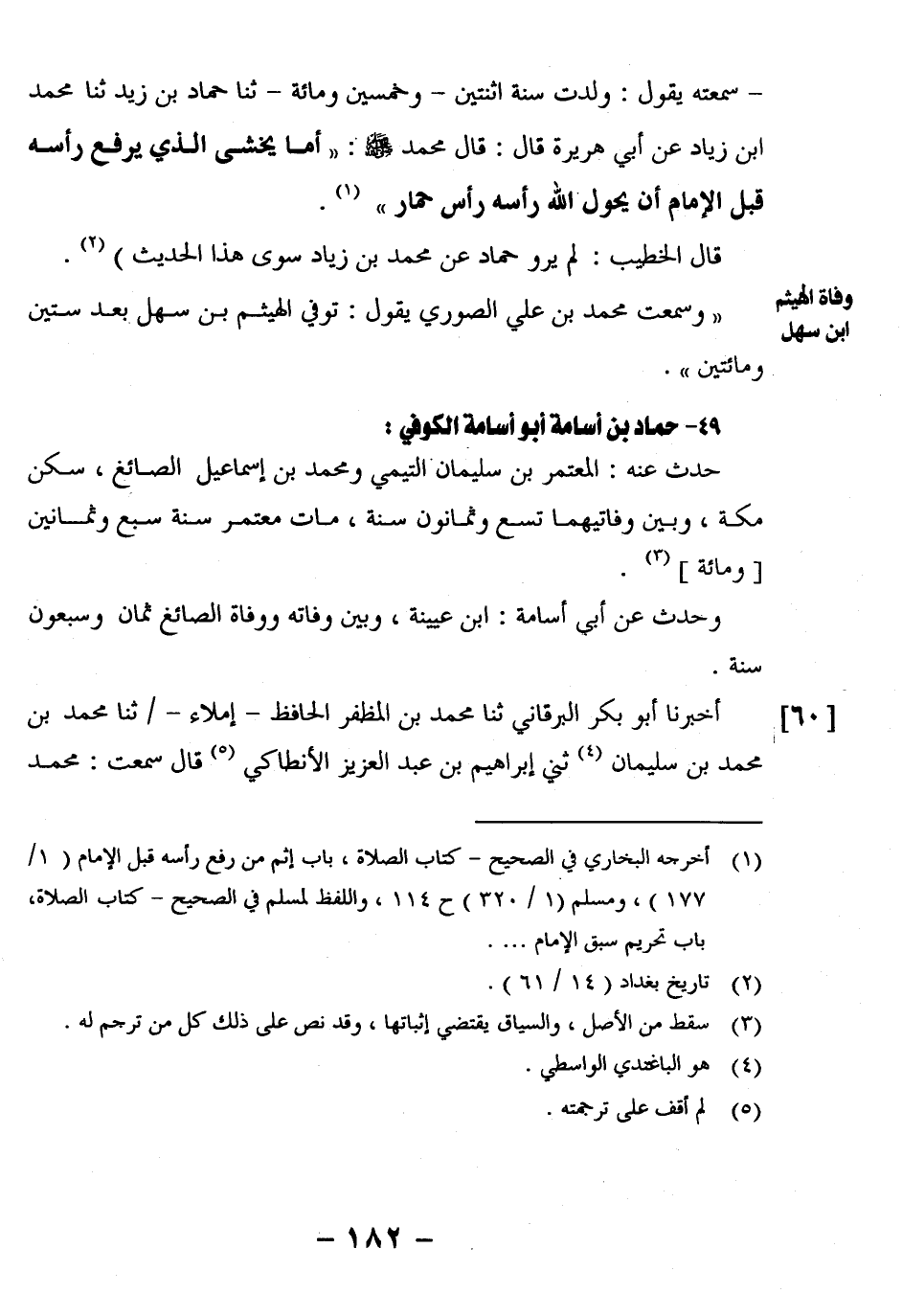 سَمِعْتُهُ يَقُولُ: وُلِدْتُ سَنَةَ اثْنَتَيْنِ- وَخَمْسِينَ وَمِائَةٍ – ثنا حَمَّادُ بْنُ زَيْدٍ ثنا مُحَمَّدُ بْنُ زِيَادٍ عَنْ أَبِي هُرَيْرَةَ قَالَ: قَالَ مُحَمَّدٌ صَلَّى اللَّهُ عَلَيْهِ وَسَلَّمَ: "أَمَا يَخْشَى الَّذِي يَرْفَعُ رَأْسَهُ قَبْلَ الإِمَامِ أَنْ يُحَوِّلَ اللَّهُ رَأْسَهُ رَأْسَ حِمَارٍ" 1.