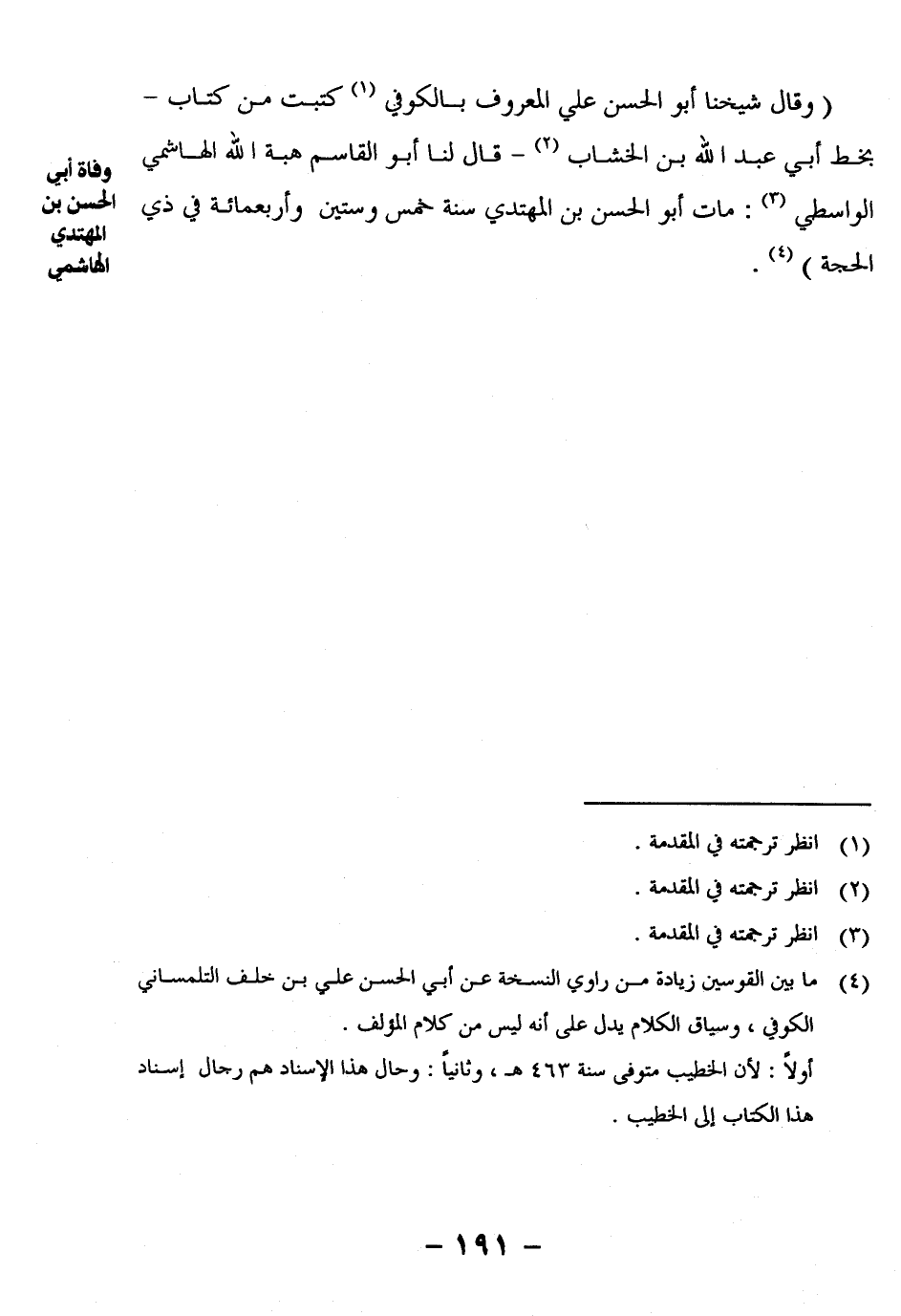 (وَقَالَ شَيْخُنَا أَبُو الْحَسَنِ عَلِيٌّ الْمَعْرُوفُ بِالْكُوفِيِّ1 كَتَبْتُ مِنْ كِتَابٍ – بِخَطِّ أَبِي عَبْدِ اللَّهِ بْنِ الْخَشَّابِ2 – قَالَ لَنَا أَبُو الْقَاسِمِ هِبَةُ اللَّهِ الْهَاشِمِيُّ الْوَاسِطِيُّ3: مَاتَ أَبُو الْحَسَنِ بْنُ المهتدي سنة خمس وستين وأربعمائة في ذي الحجة)