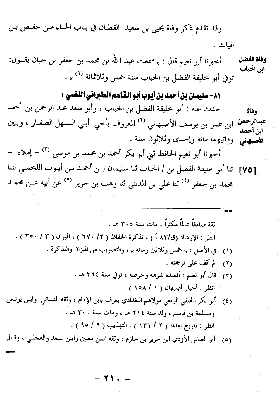أَخْبَرَنَا أَبُو نُعَيْمٍ قَالَ: "سَمِعْتُ عَبْدَ اللَّهِ بْنَ مُحَمَّدِ بْنِ جَعْفَرِ بْنِ حَيَّانَ يَقُولُ: تُوُفِّيَ أَبُو خليفة الفضل بن الحباب سنة خمس وثلاثمائة1".