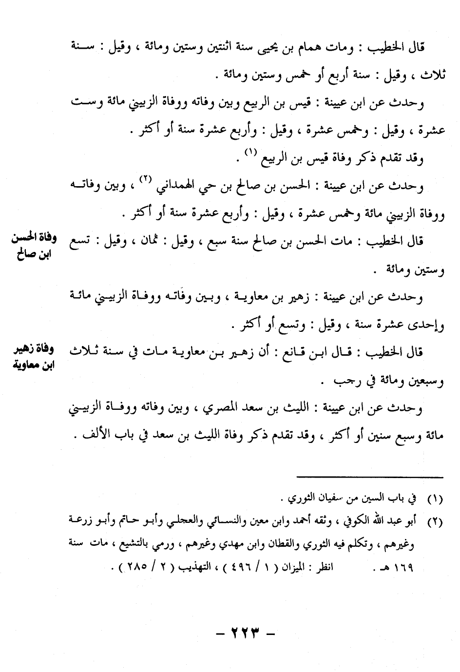 قَالَ الْخَطِيبُ: وَمَاتَ هَمَّامُ بْنُ يَحْيَى سَنَةَ اثْنَتَيْنِ وَسِتِّينَ وَمِائَةٍ، وَقِيلَ: سَنَةَ ثَلاثٍ، وَقِيلَ: سَنَةَ أَرْبَعٍ أَوْ خَمْسٍ وَسِتِّينَ وَمِائَةٍ. وَحَدَّثَ عَنِ ابْنِ عُيَيْنَةَ: قَيْسُ بْنُ الرَّبِيعِ وَبَيْنَ وفاته ووفاة الزبيني مِائَةٌ وَسِتَّ عَشْرَةَ، وَقِيلَ: وَخَمْسَ عَشْرَةَ، وَقِيلَ: وَأَرْبَعَ عَشْرَةَ سَنَةً أَوْ أَكْثَرُ.