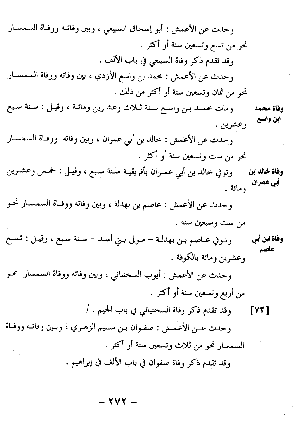 5 سقط من هنا قوله: "ومات الحسن بن عرفة سنة سبع وخمسين ومائتين"جريا على عادة المؤلف في نهاية كل ترجمة، والله أعلم.