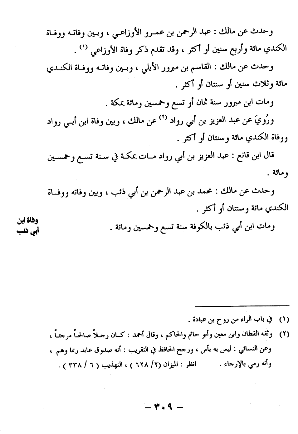 ورُوي عَنْ عَبْدِ الْعَزِيزِ بْنِ أَبِي رواد2 عن مالك، وبين وفاة بن أَبِي رَوَّادٍ وَوَفَاةِ الْكِنْدِيِّ مِائَةٌ وَسَنَتَانِ أَوْ أَكْثَرُ.