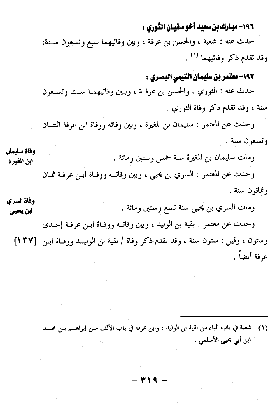وَحَدَّثَ عَنِ الْمُعْتَمِرِ: سُلَيْمَانُ بْنُ الْمُغِيرَةِ، وَبَيْنَ وَفَاتِهِ وَوَفَاةِ ابْنِ عَرَفَةَ اثْنَتَانِ وَتِسْعُونَ سَنَةً.