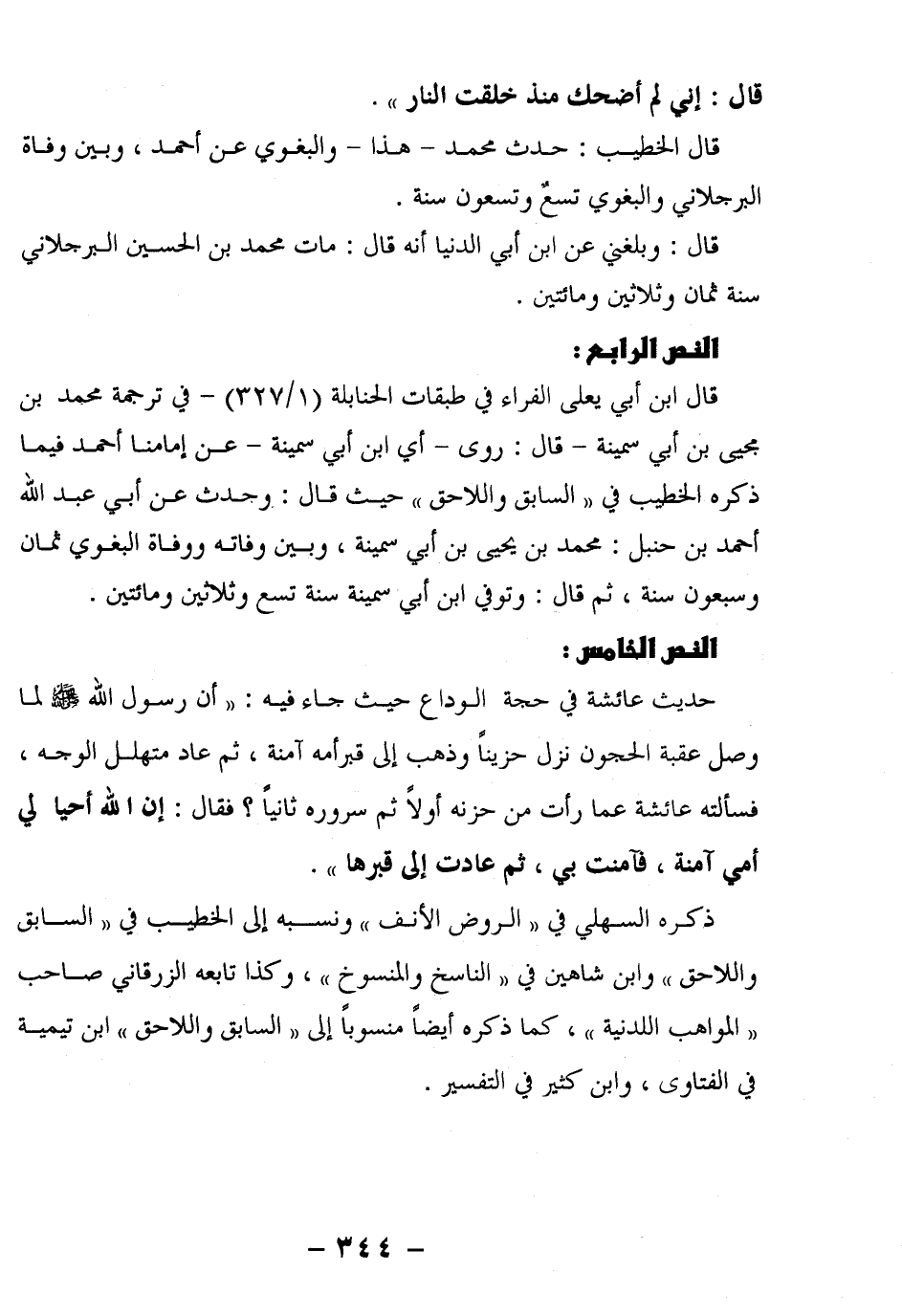حديث عائشة في حجة الوراع حيث جاء فيه: "أَنَّ رَسُولَ اللَّهِ صَلَّى اللَّهُ عَلَيْهِ وَسَلَّمَ لما وصل عقبة الحجون نزل حزيناً وذهب إلى قبر أمه آمنة، ثم عاد متهلل الوجه، فسألته عائشة عما رأت من حزنه أولاً ثم سروره ثانياً؟ فقال: إن الله أحيا لي أمي آمنة، فآمنت بي، ثم عادت إلى قبرها".