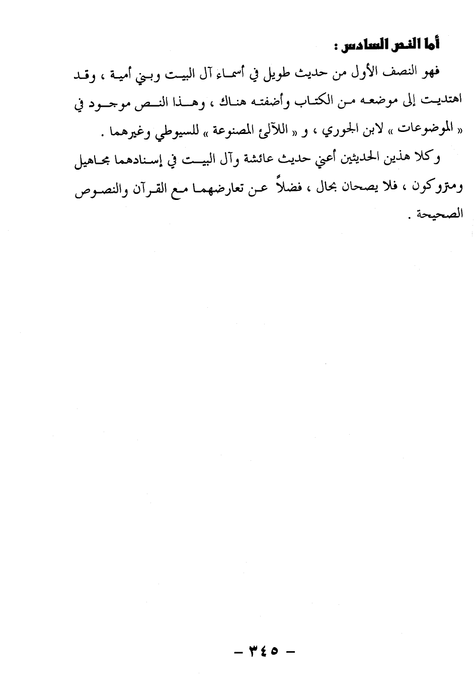 فهو النص الأول من حديث طويل في أسماء آل البيت وبني أمية، وقد اهتديت إلى موضعه من الكتاب وأضفته هناك، وهذا النص موجود في "الموضوعات" لابن الجوزي، و"اللآلئ المصنوعة" للسيوطي وغيرهما.