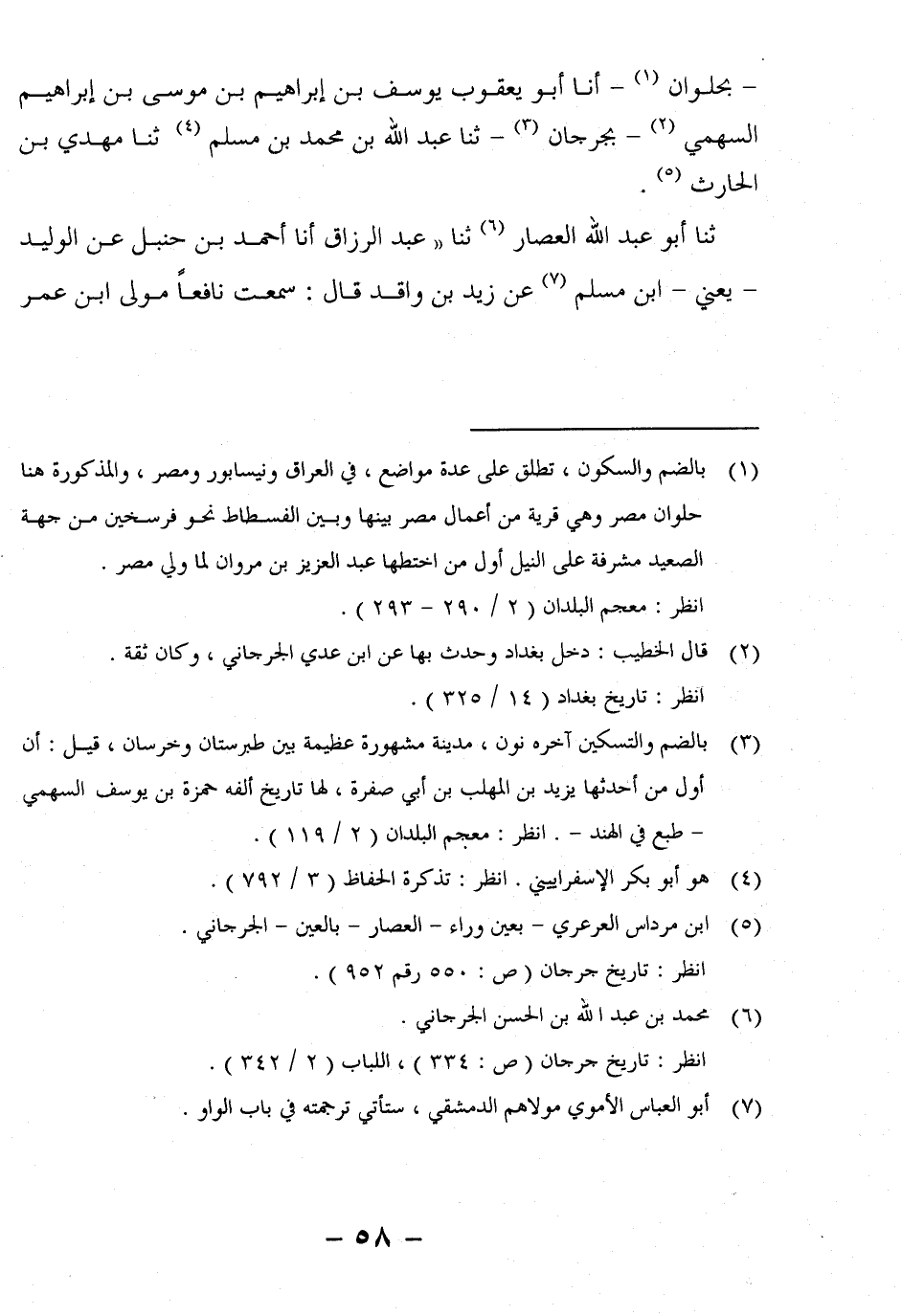 -بِحُلْوَانَ1 – أنا أَبُو يَعْقُوبَ يُوسُفُ بْنُ إِبْرَاهِيمَ بْنِ مُوسَى بْنِ إِبْرَاهِيمَ السَّهْمِيُّ2 - بِجُرْجَانَ3 – ثنا عَبْدُ اللَّهِ بْنُ مُحَمَّدِ بْنِ مُسْلِمٍ4 ثنا مَهْدِيُّ بْنُ الْحَارِثِ5.