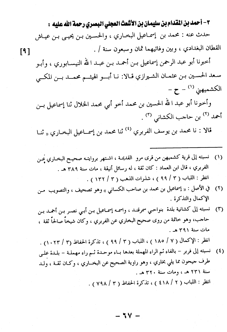 قَالا: نا مُحَمَّدُ بْنُ يُوسُفَ الْفَرَبْرِيُّ4 ثنا مُحَمَّدُ بْنُ إِسْمَاعِيلَ البخاري "ثنا