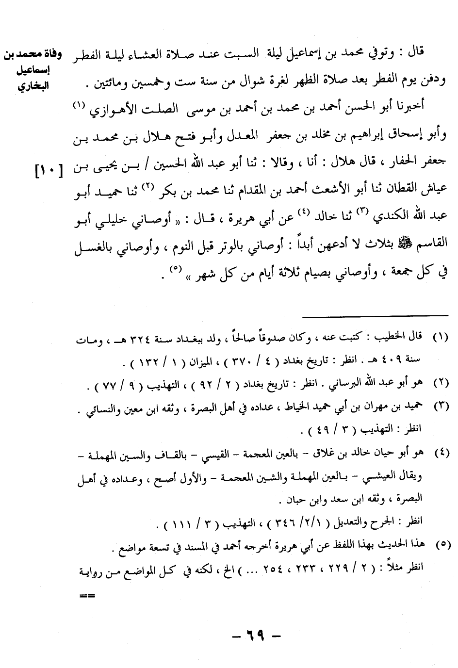 أَخْبَرَنَا أَبُو الْحَسَنِ أَحْمَدُ بْنُ مُحَمَّدِ بْنِ أَحْمَدَ بْنِ مُوسَى الصَّلْتُ الأَهْوَازِيُّ1 وَأَبُو إِسْحَاقَ إِبْرَاهِيمُ بْنُ مَخْلَدِ بْنِ جَعْفَرٍ الْمُعَدَّلُ وَأَبُو فَتْحٍ هِلالُ بْنُ مُحَمَّدِ بْنِ جَعْفَرٍ الْحَفَّارُ، قَالَ هِلالٌ: أنا، وَقَالا: ثنا أَبُو عَبْدِ اللَّهِ الْحُسَيْنُ/ بْنُ يَحْيَى بْنِ عَيَّاشٍ الْقَطَّانُ ثنا أَبُو الأَشْعَثِ أَحْمَدُ بْنُ الْمِقْدَامِ ثنا مُحَمَّدُ بْنُ بَكْرٍ2 ثنا حُمَيْدٌ أَبُو عَبْدِ اللَّهِ الْكِنْدِيُّ3 ثنا خَالِدٌ4 عَنْ أَبِي هُرَيْرَةَ، قَالَ: "أَوْصَانِي خَلِيلِي أبو القاسم بِثَلاثٍ لا أَدَعُهُنَّ أَبَدًا: أَوْصَانِي بِالْوِتْرِ قَبْلَ النَّوْمِ، وَأَوْصَانِي بِالْغُسْلِ فِي كُلِّ جُمُعَةٍ، وَأَوْصَانِي بِصِيَامِ ثَلاثَةِ أَيَّامٍ مِنْ كُلِّ شَهْرٍ"5.