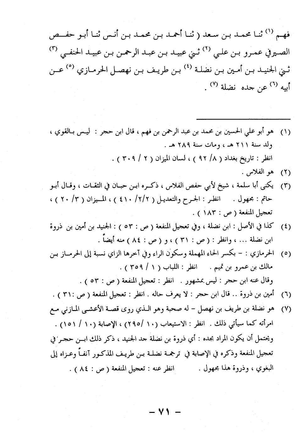فَهْمٍ1 ثنا مُحَمَّدُ بْنُ سَعْدٍ (ثنا أَحْمَدُ بْنُ مُحَمَّدِ بْنِ أَنَسٍ ثنا أَبُو حَفْصٍ الصَّيْرَفِيُّ عَمْرُو بْنُ عَلِيٍّ2 ثني عُبَيْدُ بْنُ عَبْدِ الرَّحْمَنِ بْنِ عُبَيْدٍ الْحَنَفِيُّ3 ثني الْجُنَيْدُ بْنُ أَمِينِ بْنِ نَضْلَةَ4 بْنِ طَرِيفِ بْنِ نَهْصَلٍ الْحِرْمَازِيُّ5 عَنْ أَبِيهِ6 عَنْ جده نضلة7
