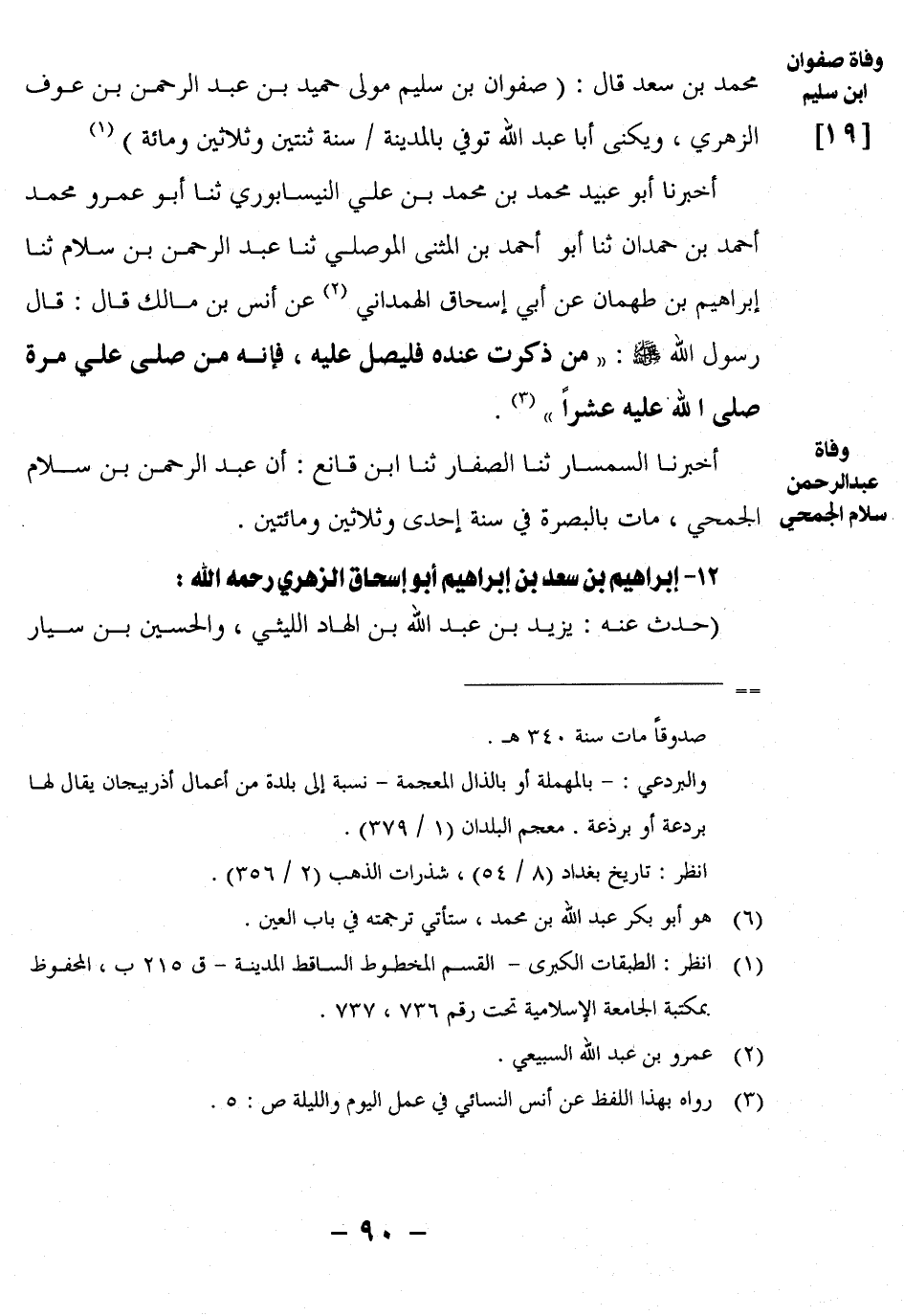 مُحَمَّدُ بْنُ سَعْدٍ قَالَ: (صَفْوَانُ بْنُ سُلَيْمٍ مَوْلَى حُمَيْدِ بْنِ عَبْدِ الرَّحْمَنِ بْنِ عَوْفٍ الزُّهْرِيِّ، وَيُكَنَّى أَبَا عَبْدِ اللَّهِ تُوُفِّيَ بِالْمَدِينَةِ/ سَنَةَ ثِنْتَيْنِ وَثَلاثِينَ وَمِائَةٍ)
